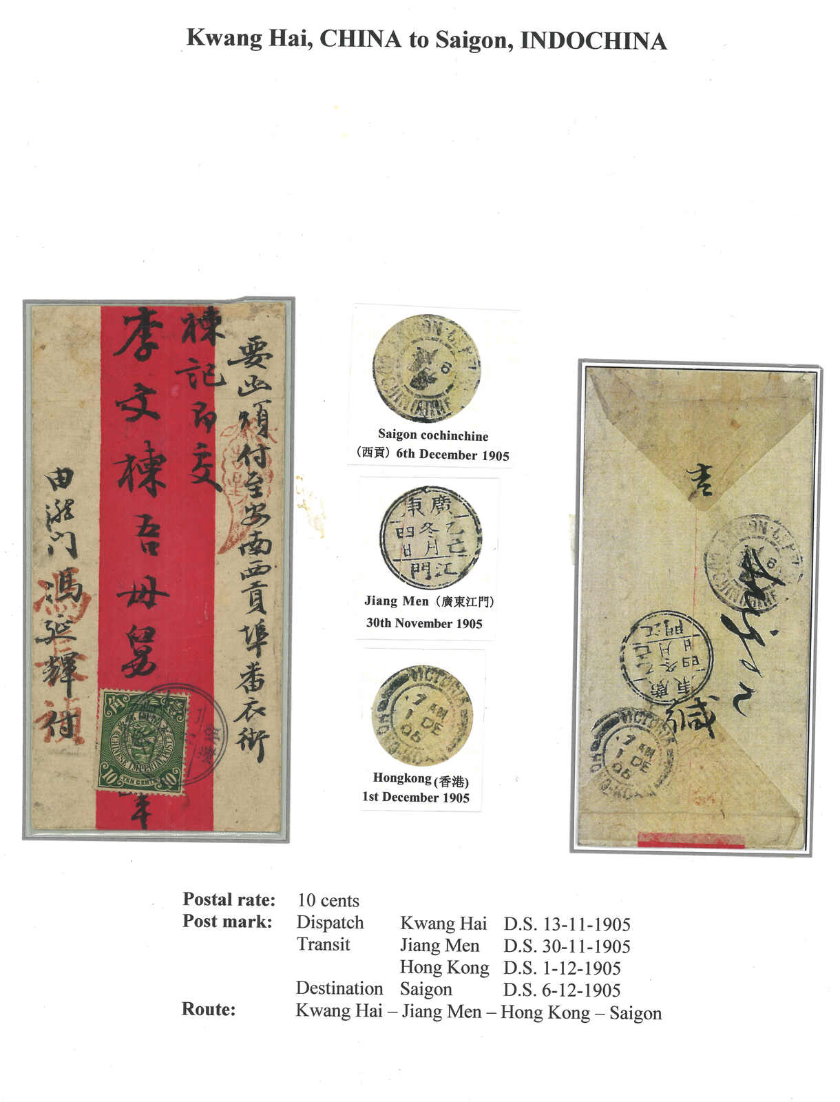 1905.11.13 廣海寄西貢。紅條封,貼蟠龍1角,銷廣東廣海雙圈 干支日戳。11.30經江門,12.1經香港。12.6抵西貢。(Image 1) (All Images)