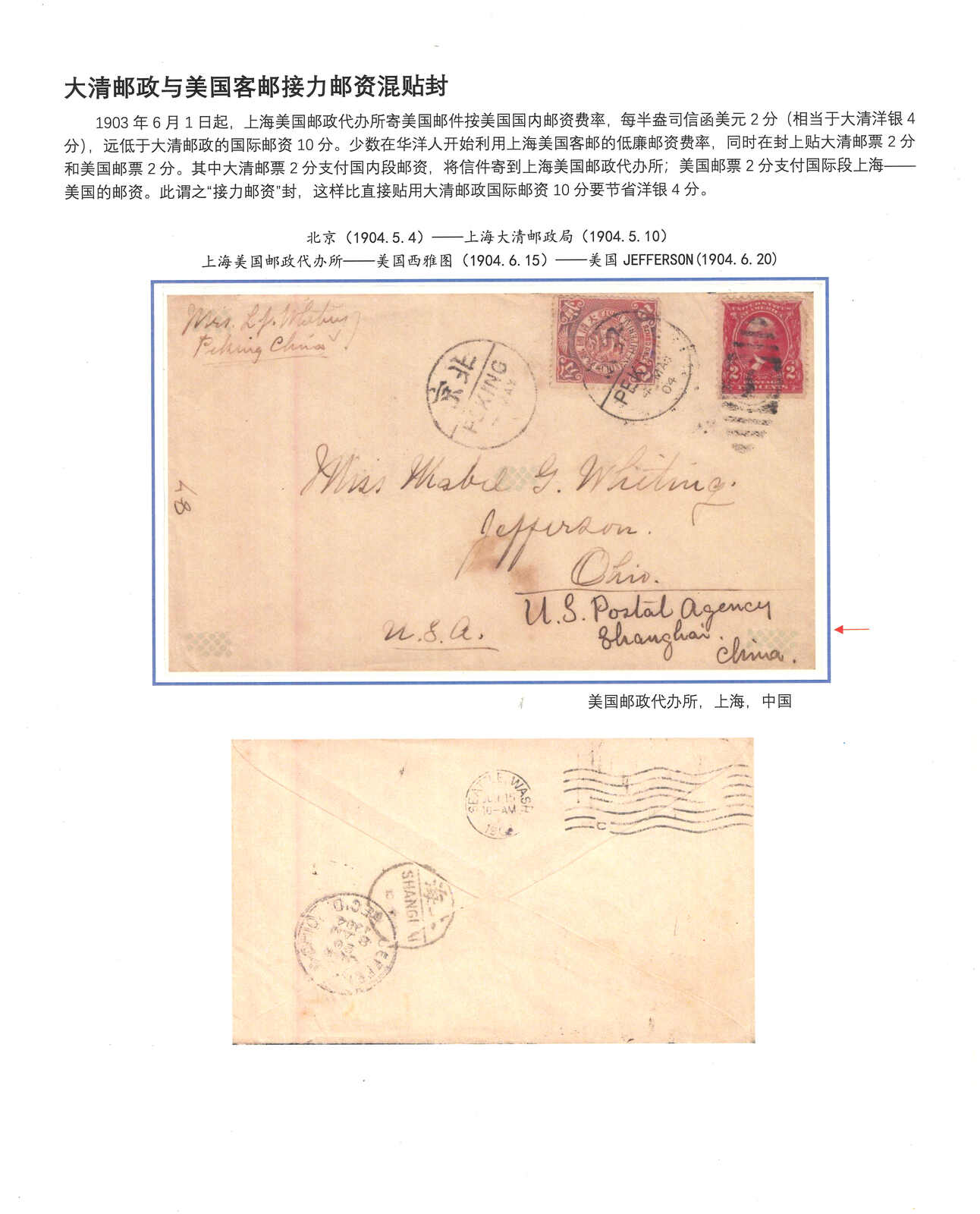 1904.2.4 北京寄美國,貼蟠龍2分,合國內郵資,銷北京半切漢英日戳。5.10經上海清郵。加貼美國票2分,合美國國內郵資,銷上海美國郵政代理殺手戳。6.20抵美國。同時貼大清及外國票之“接力郵資”而非直接貼付國際郵資以節省郵費,(Image 1) (All Images)