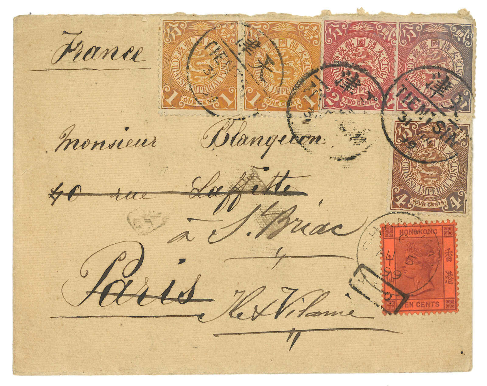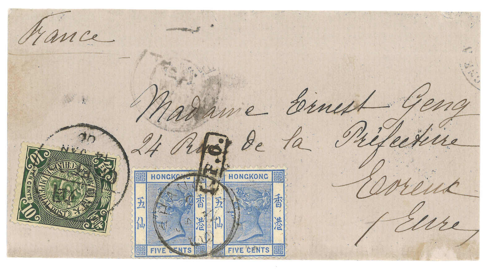1900.1.14 煙台寄法國。信封封面,貼蟠龍1角,銷煙台半切漢英日戳。加貼香港維多利亞女皇像5仙雙連,銷煙台IPO騎縫戳及上海英局1.22日戳。抵法國。2004.1 PhilaChina,拍品號1109。(Image