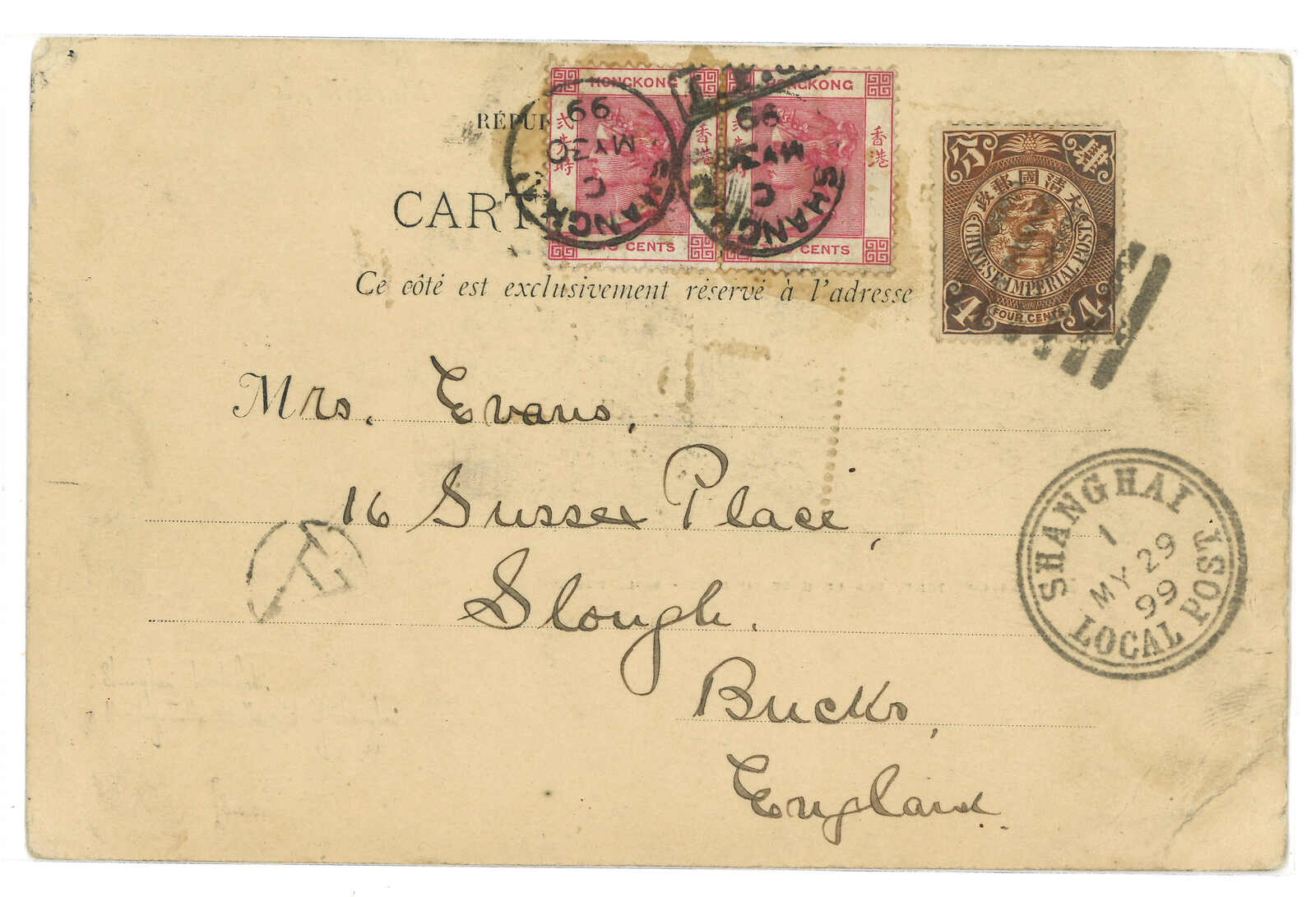 1899 Shanghai (29 May) to England. View PPC, applied with Shanghai LPO origin cds. F.w. Coiling Dragon 4c, tied by Pakua cancel. In combination with Hong Kong QV 2c in pair, tied by IPO tie-print and Shanghae BPO (30 May) cds.
