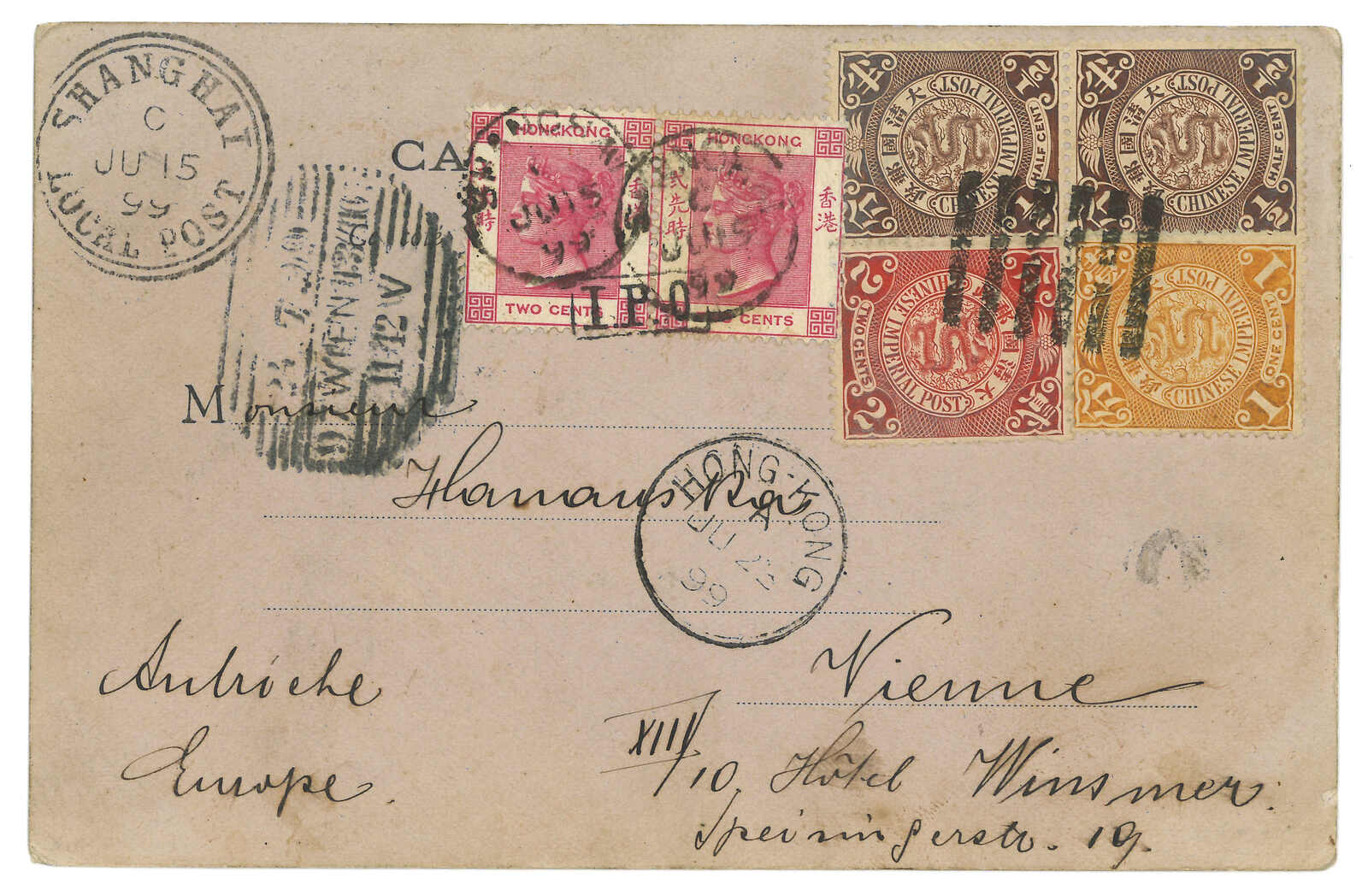 1899.6.15 上海寄奧國。外灘風光明信片,鈐上海工部郵局始發日戳。貼蟠龍4枚,合4分,銷八卦戳。加貼香港維多利亞女皇像2仙雙連,銷上海Webb 1型IPO騎縫戳及上海英局同月日戳。6.23經香港。7.24抵維也納。(Image 1)