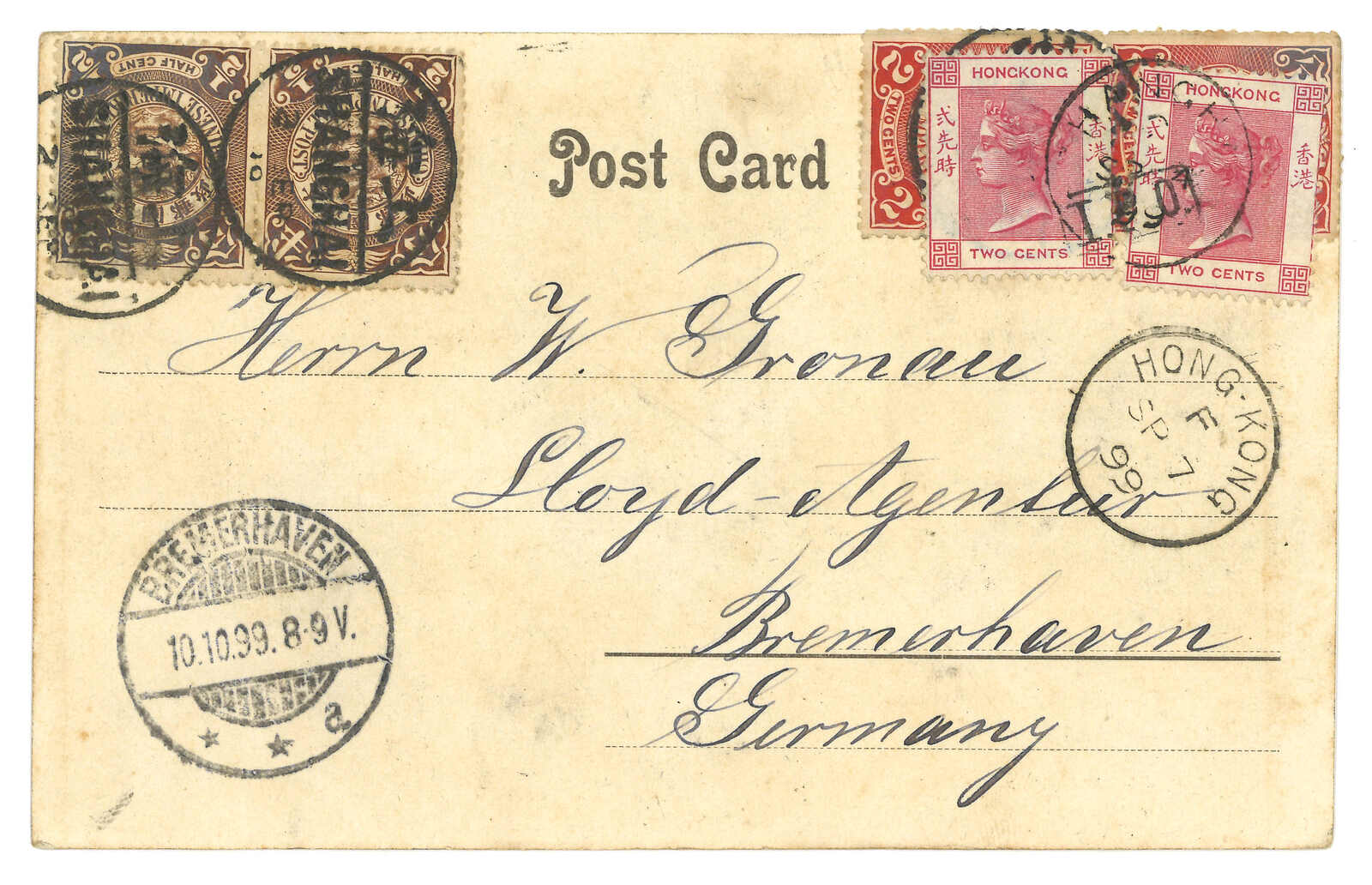 1899.9.2 上海寄德國。圖片明信片,貼蟠龍半分雙連 + 2分雙連,銷上海半切漢英日戳。加貼香港維多利亞女皇像2仙x2,銷上海Webb 1型上海IPO騎縫戳及上海英局日戳。9.7經香港。10.10抵不萊梅。(Image 1)