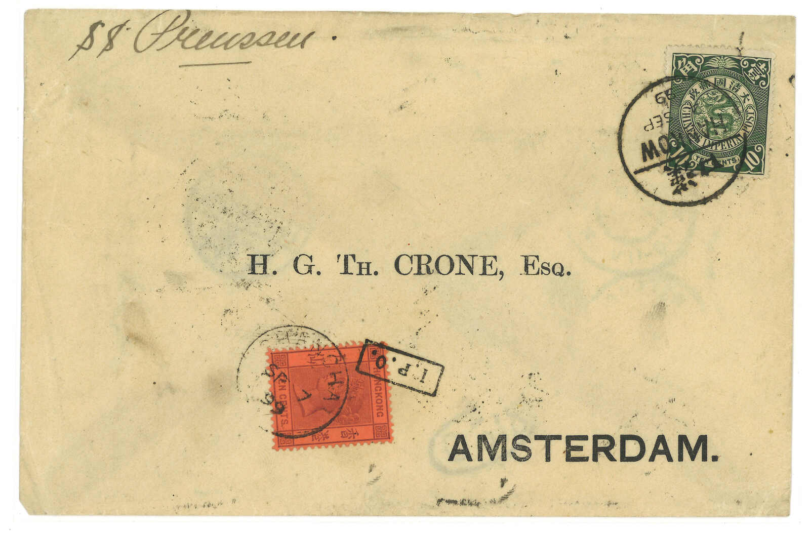 1899.9.2 漢口寄荷蘭,貼蟠龍1角,銷漢口半切漢英日戳。9.2經上海中國郵局。加貼香港維多利亞女皇像1角,銷漢口Webb 3型IPO騎縫戳及上海英局9.7日戳。9.10經香港。10.12抵阿姆斯特丹。2009.3 布約翰,拍品號2540。(Image 1)