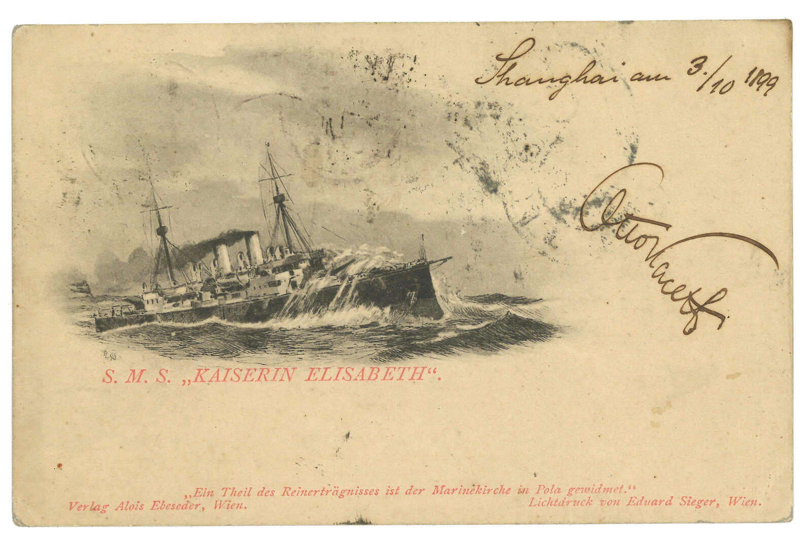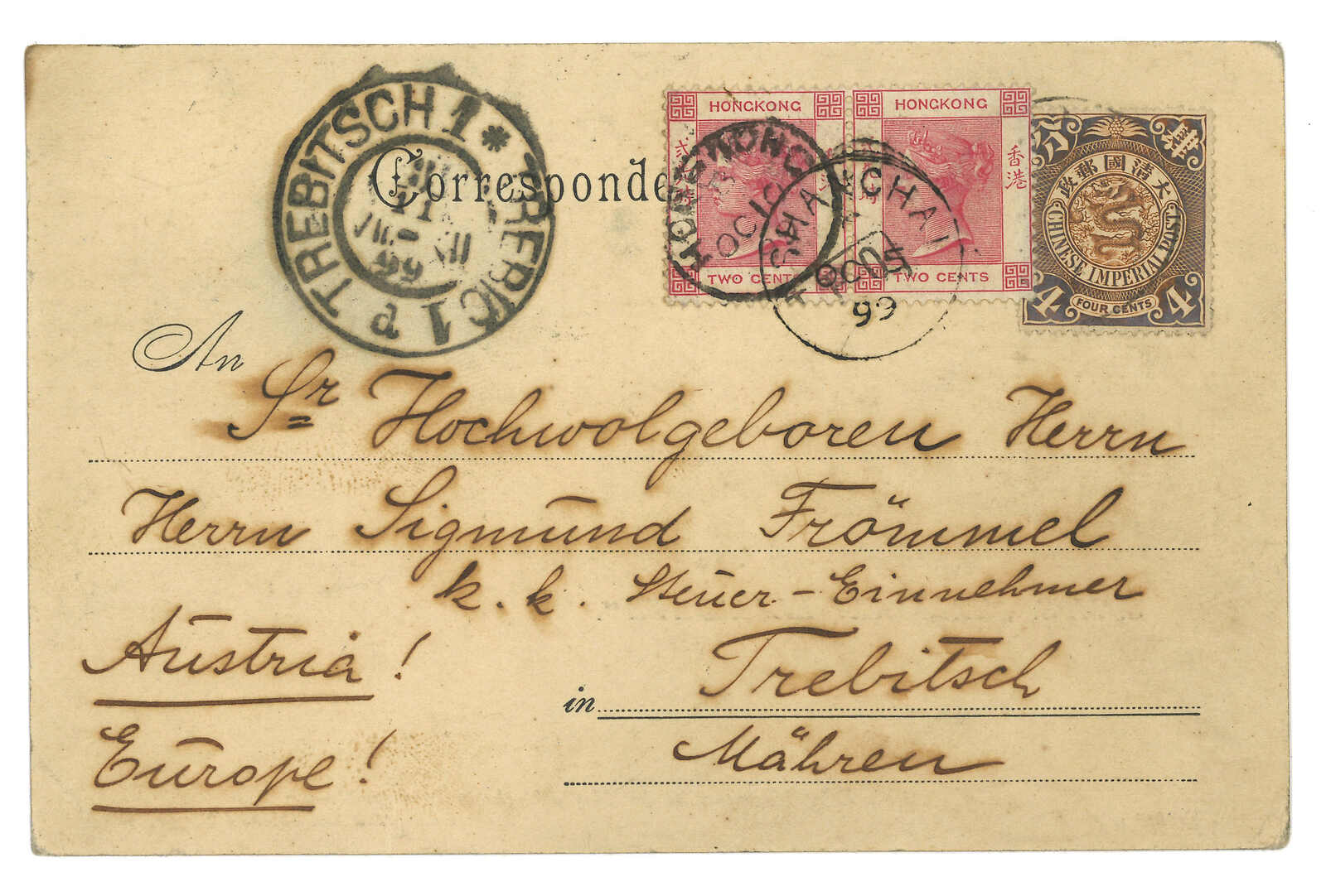 1899.10.3 上海寄奧國。德國戰艦Kaiserin Elisabeth圖片明信片,貼蟠龍4分。加貼香港維多利亞女皇像2仙雙連,銷上海Webb 1型IPO騎縫戳及上海英局10.5日戳。抵Trebitsch。2010.9 蘇黎世亞洲,拍品號3048。(Image 1)