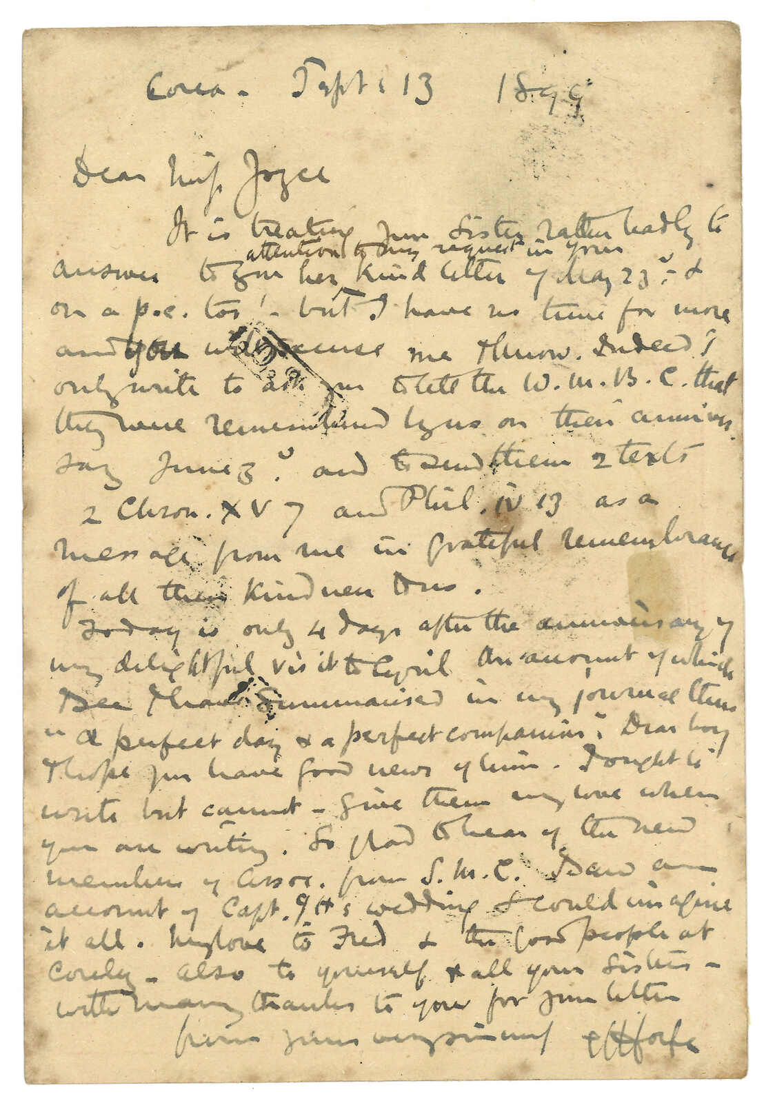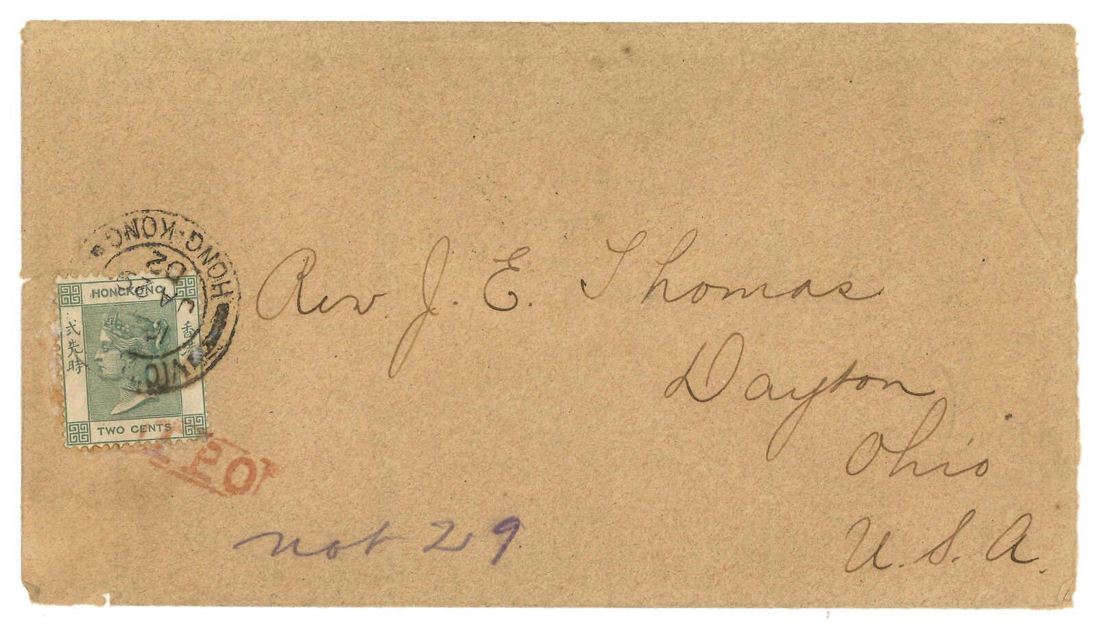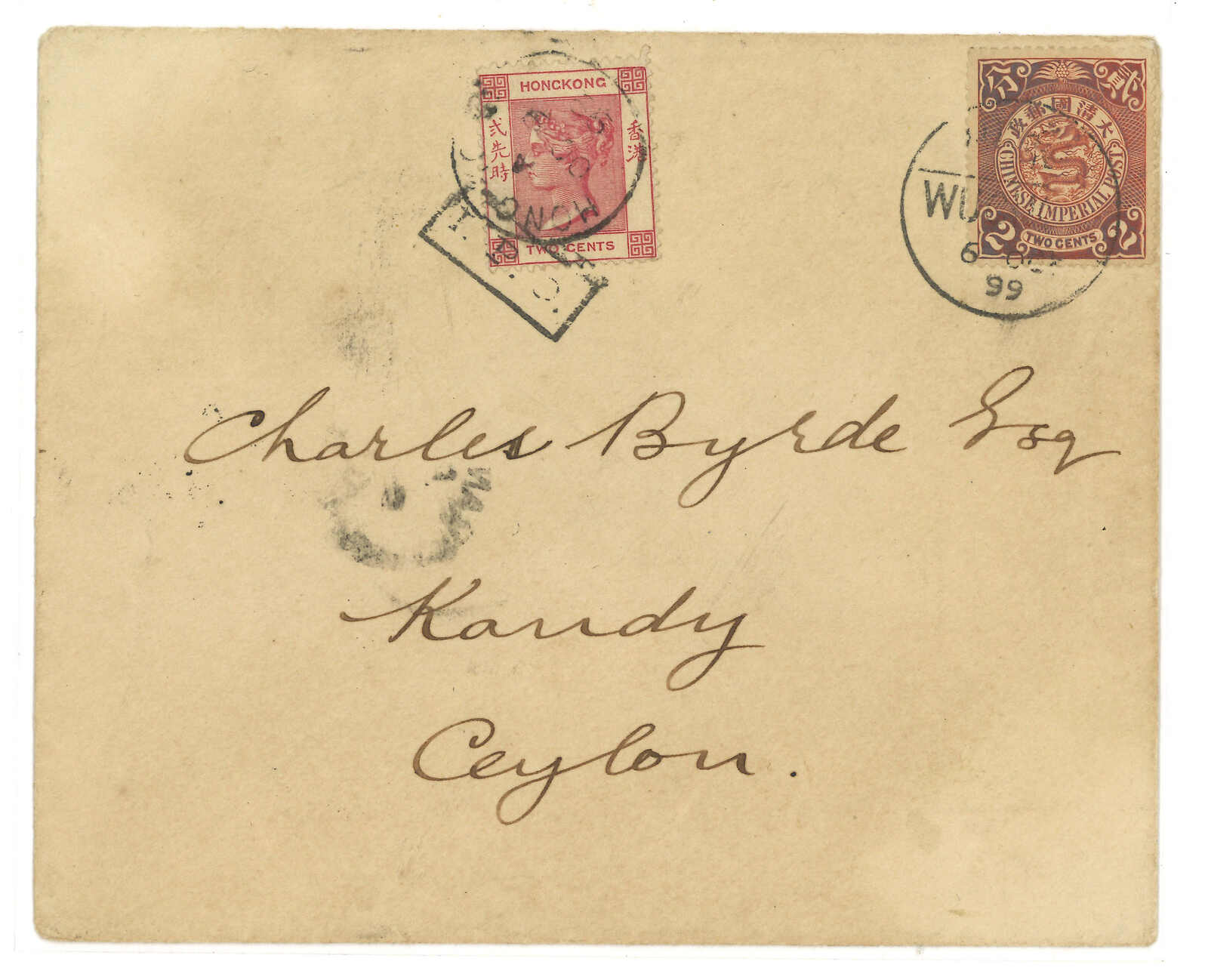1899.10.6 梧州寄錫蘭,貼蟠龍2分,銷梧州半切漢英日戳。加貼香港維多利亞女皇像2仙,銷梧州IPO騎縫戳及香港10.9日戳。10.21經可倫坡。10.22抵Kandy。2009.3 PhilaChina,拍品號519。(Image 1)