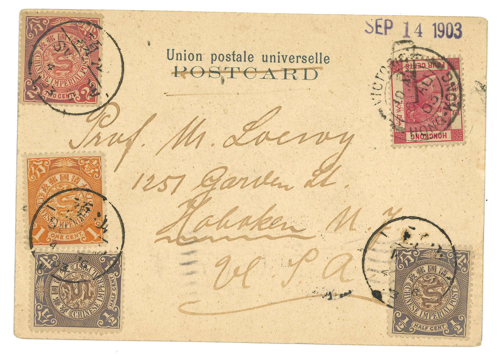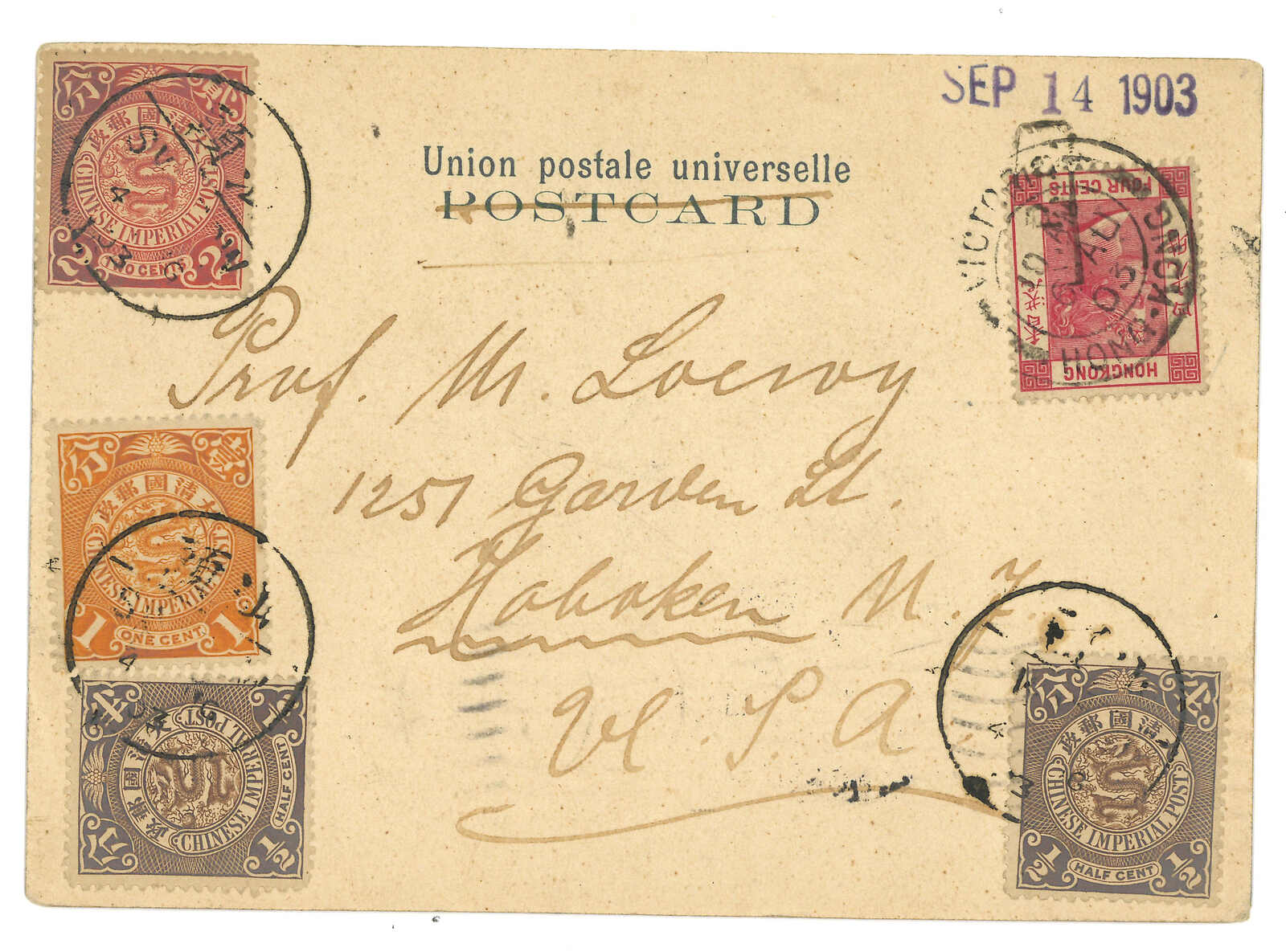 1903.8.4 汕頭寄美國。香港街景明信片,貼蟠龍4枚,合4分,銷汕頭半切漢英日戳。加貼香港維多利亞女皇像4仙,銷汕頭Webb 4型IPO騎縫戳及維多利亞8.6日戳。9.11抵美國。2007.11 蘇黎世亞洲,拍品號1350。(Image 1)