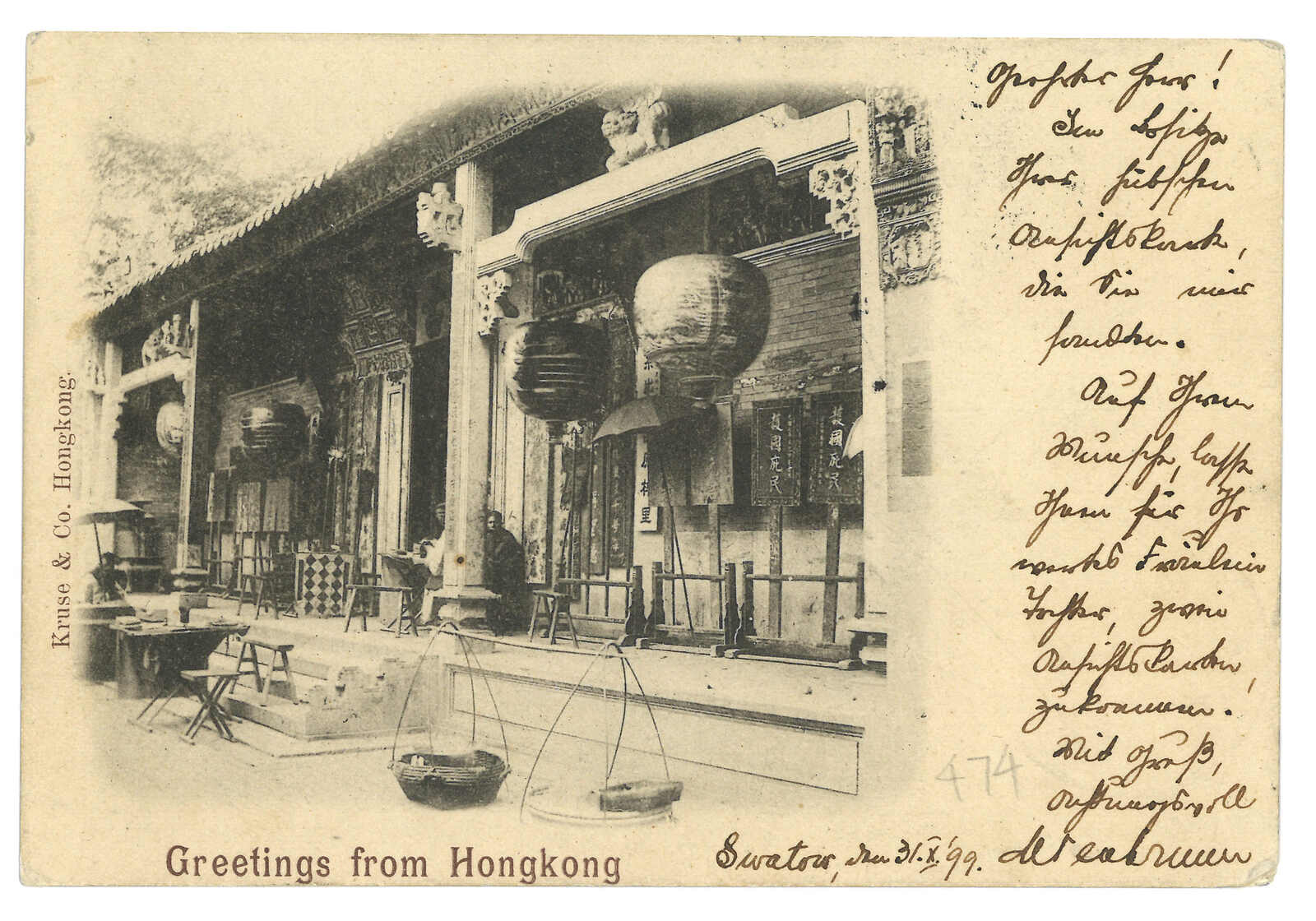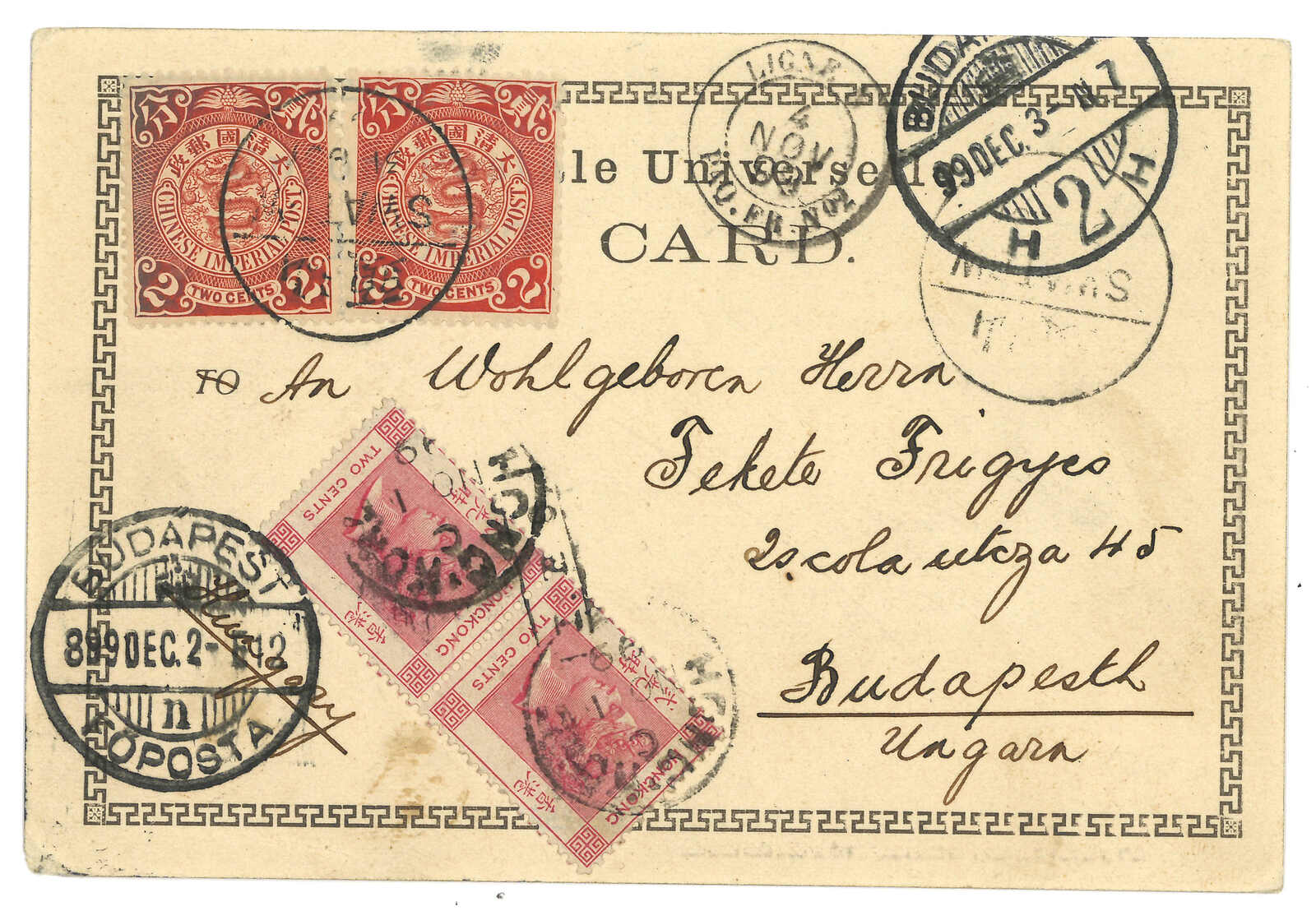 1899.10.31 汕頭寄匈牙利。圖片明信片,蟠龍2分x2,銷汕頭半切漢英日戳。加貼香港維多利亞女皇像2仙雙連,銷汕頭Webb 1型IPO騎縫戳及香港11.1日戳。11.4經法國郵船。12.3抵布達佩斯。2007.11 蘇黎世亞洲,拍品號1346。(Image 1)