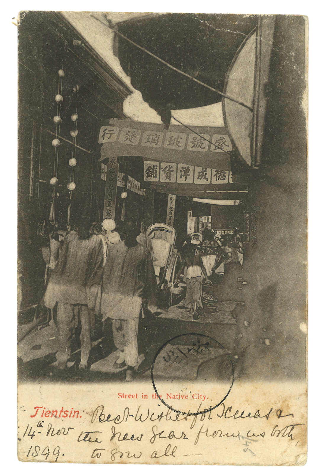 1899.11.14 天津寄英國。圖片明信片,貼蟠龍2分雙連,銷天津半切漢英日戳。經上海英局。加貼香港維多利亞女皇像2仙雙連,銷天津Webb 1型IPO騎縫戳及上海英局11.22日戳。2008.1.20 斯賓克中國,拍品號919。(Image 1)
