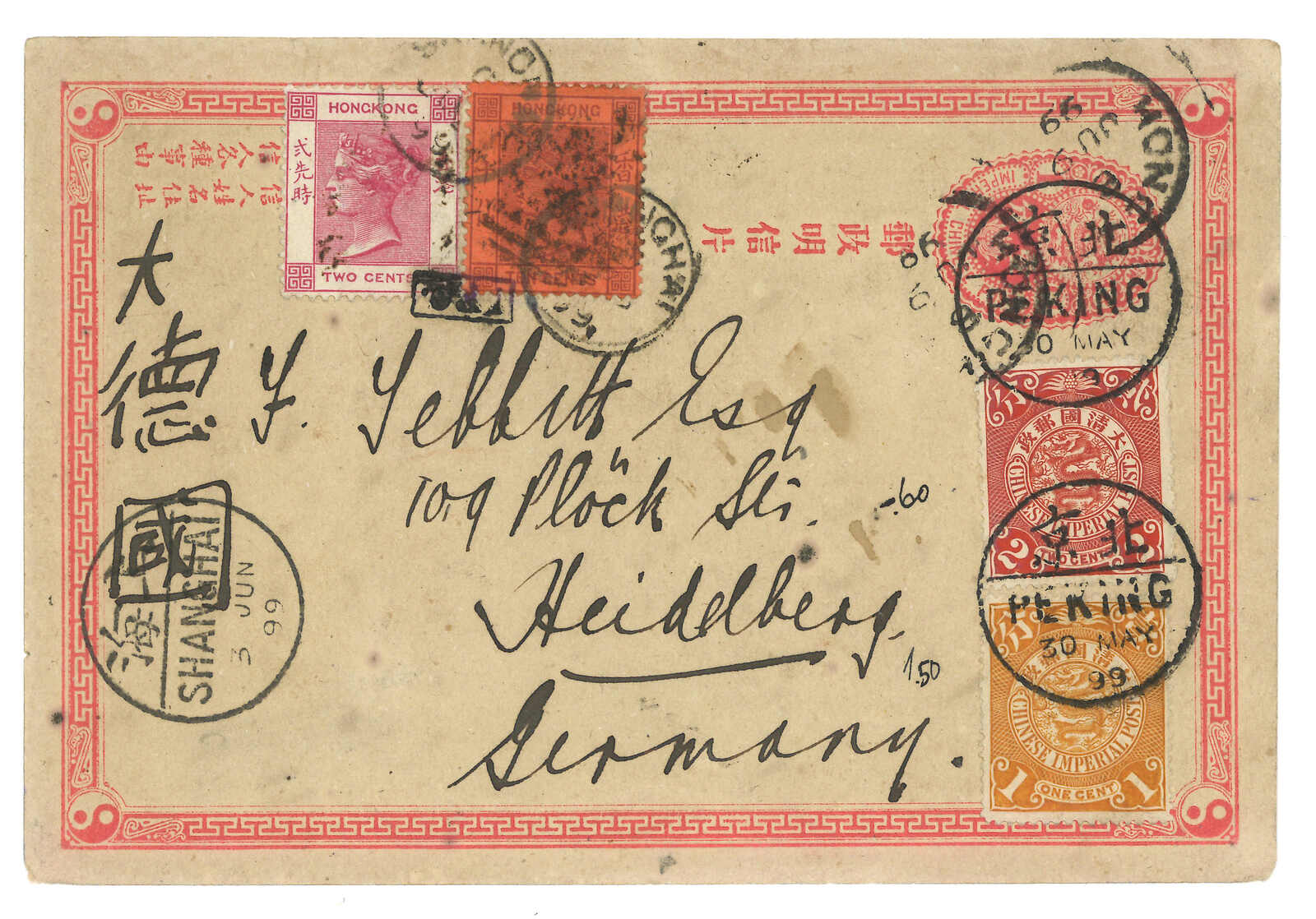 1899 Peking (30 May) to Germany. ICP 1st Print PSC, uprated by Coiling Dragon 1c + 2c, tied by Peking bisected bilingual cds. Transit Shanghai Chinese PO (3 Jun). In combination with Hong Kong QV 2c + 10c, tied by Peking Webb
