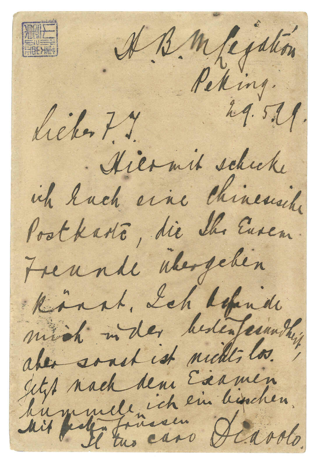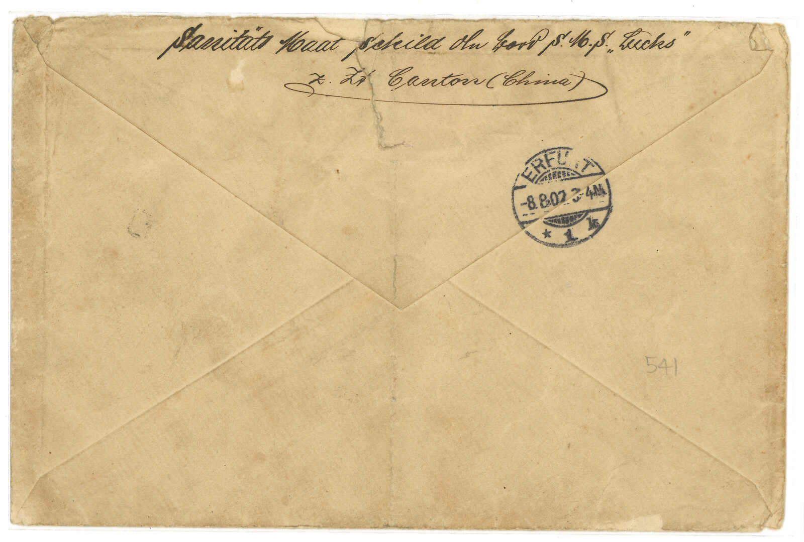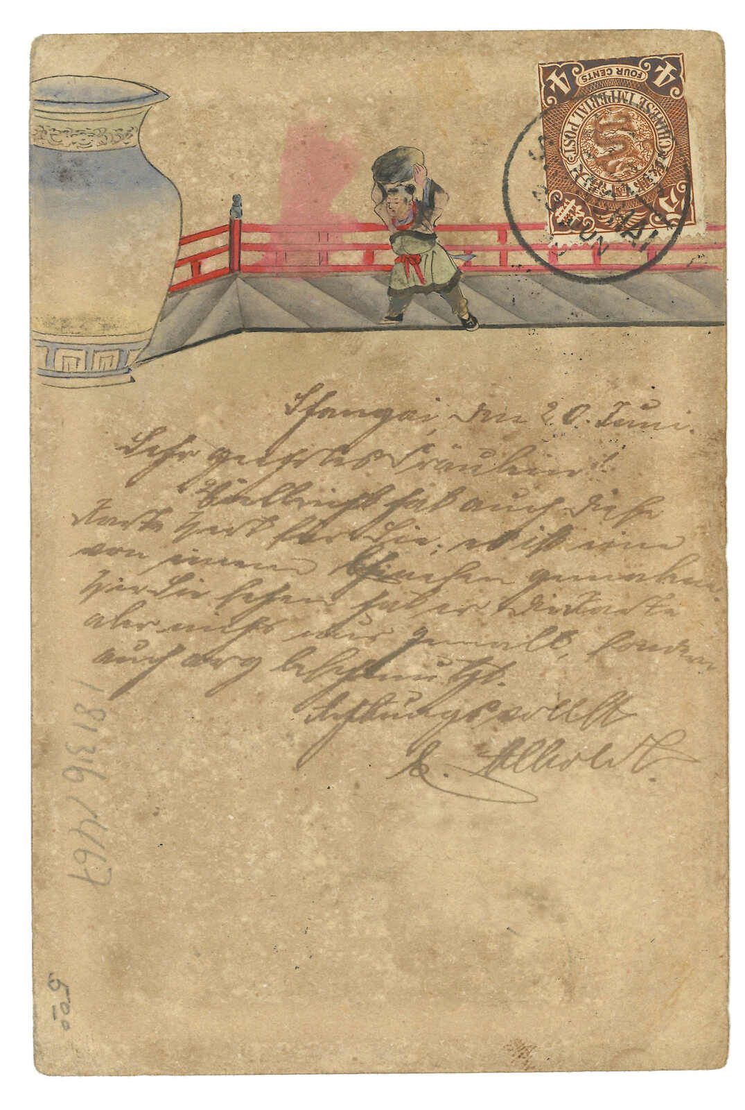 Transit Hong Kong. Arrived Eberswalde (31 Jul). Content side with coloured handpainting. 2006 (Nov) Zurich Asia, lot 467.