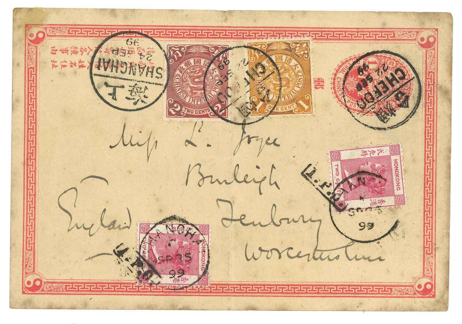 1899.9.22 煙台寄英國。大清第版郵資片,加貼蟠龍1分 + 2分,銷煙台半切漢英日戳。9.24經上海中國郵局。加貼香港維多利亞女皇像2仙,銷煙台IPO騎縫戳及上海英局9.25日戳。2005.5 PhilaChina,拍品號199。(Image 1)