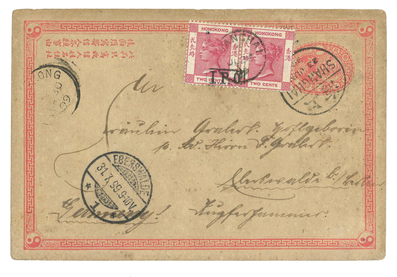 1899.6.23 上海寄德國。大清第一版郵資片,加貼蟠龍4分,銷上海半切漢英日戳。加貼香港維多利亞女皇像2仙雙連,銷上海IPO騎縫戳及上海英局日戳。經香港。7.31抵Eberswalde。內容一面帶手繪圖案。2006.11