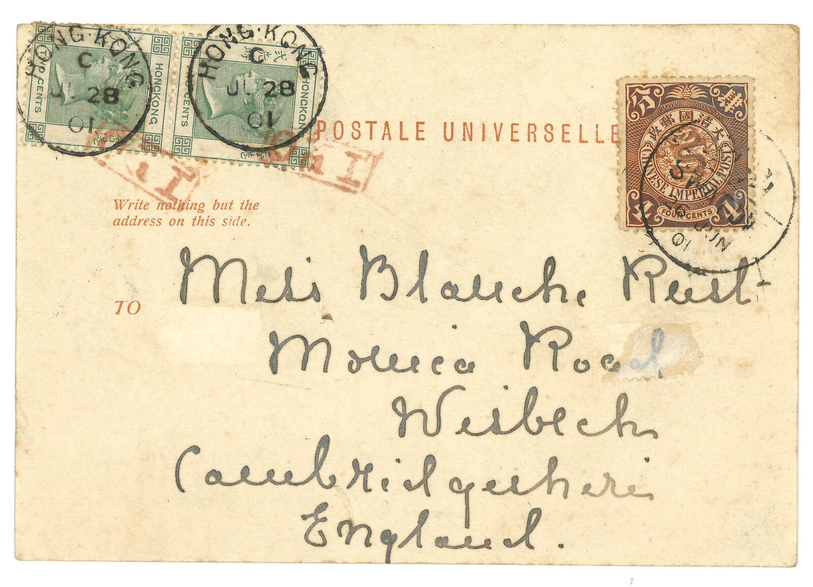 1901 Swatow (26 Jun) to England. HSBC PPC, f.w. Coiling Dragon 4c, tied by Swatow bisected bilinguaul cds. In combination with Hong Kong QV 2c in pair, tied by Swatow Webb type 3 IPO tie-print in red and Hong Kong (28 Jun) cds.