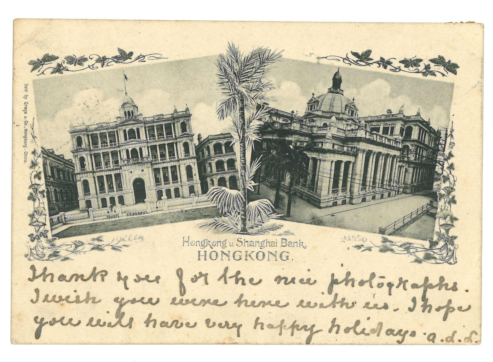 1901.6.26 汕頭寄英國。匯豐銀行圖片明信片,貼蟠龍4分,銷汕頭半切漢英日戳。加貼香港維多利亞女皇像2仙雙連,銷汕頭Webb 3型IPO騎縫戳及香港6.28日戳。2008.6 布約翰,拍品號675。(Image 1)