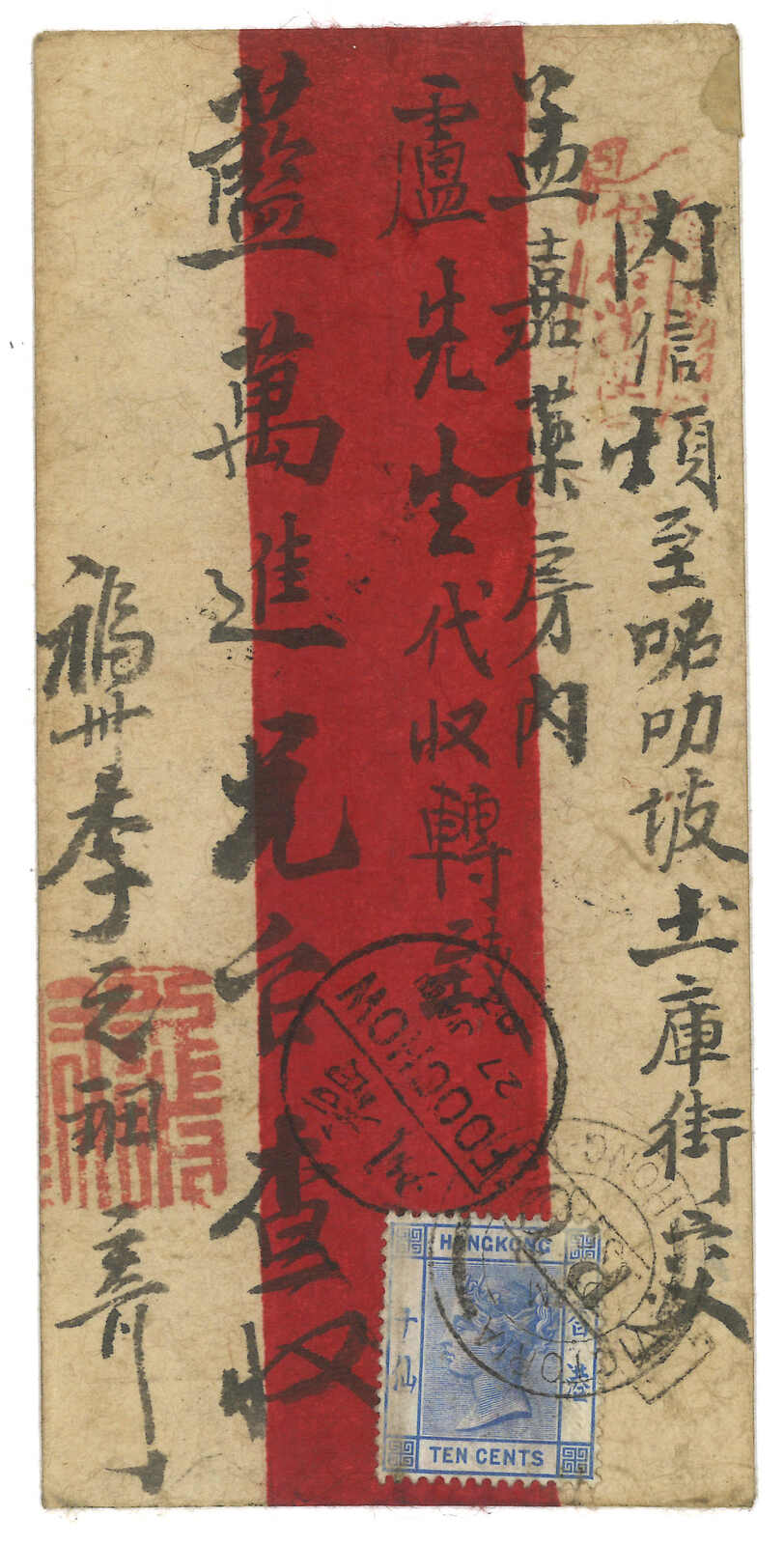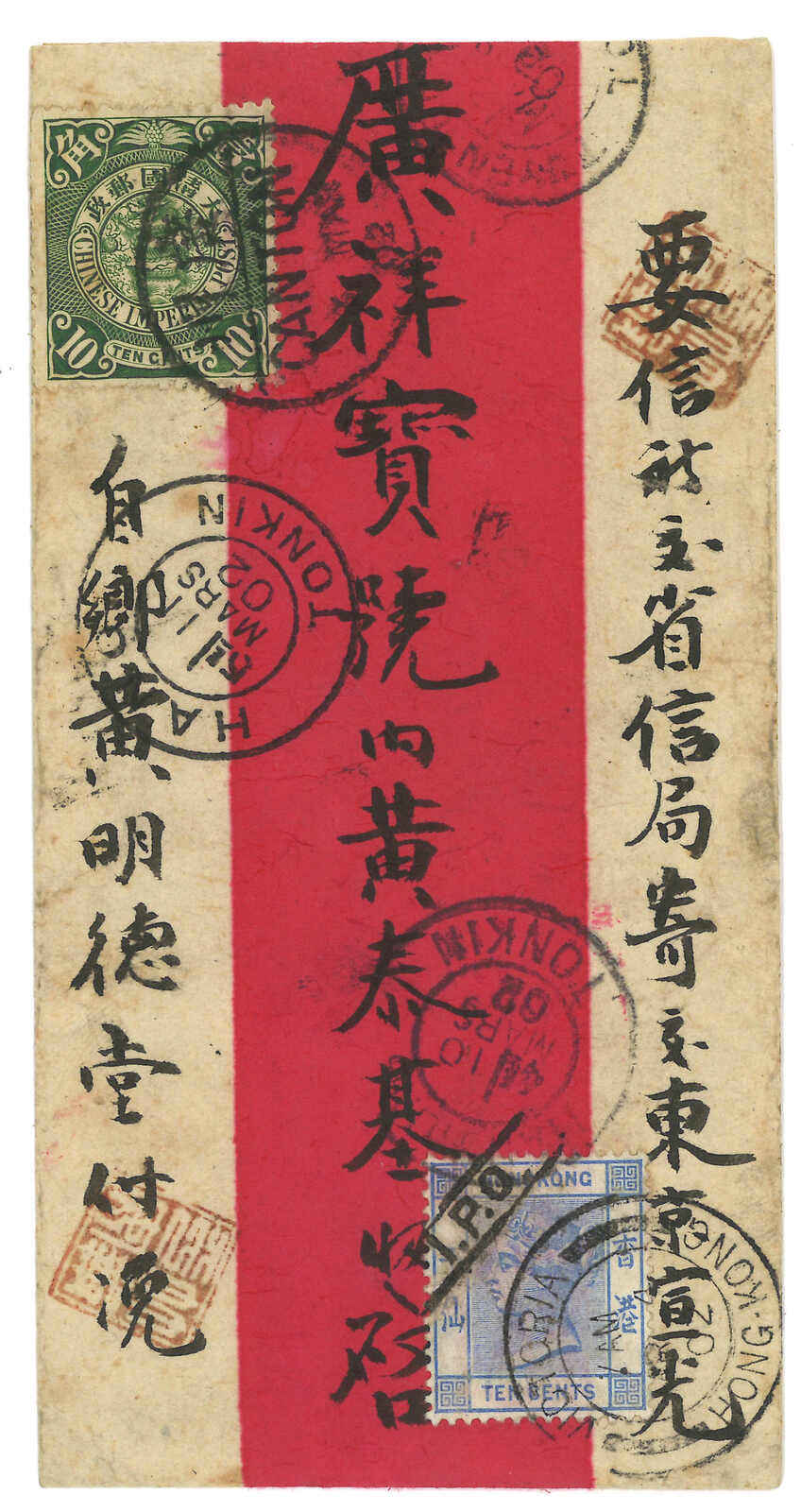 1902 Canton (3 Mar) to Hanoi. Red band cover, f.w. Coiling Dragon 10c, tied by Canton bisected bilingual cds. In combination with Hong Kong QV 10c, tied by Canton Webb type 2 IPO tie-print and Victoria (4 Mar) cds. Arrived