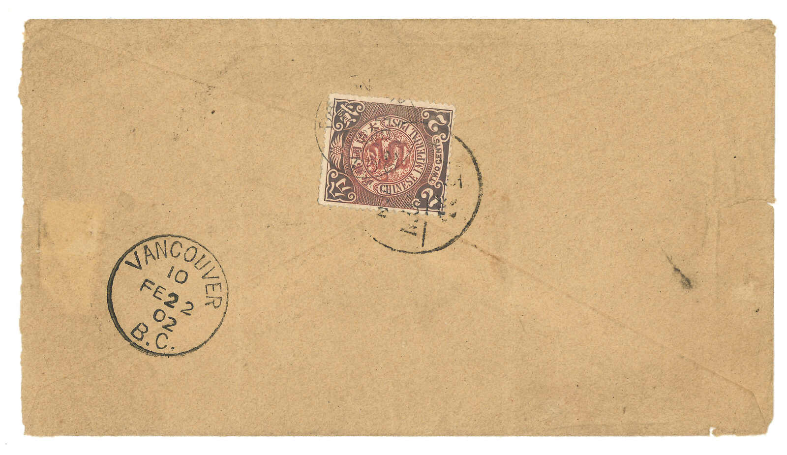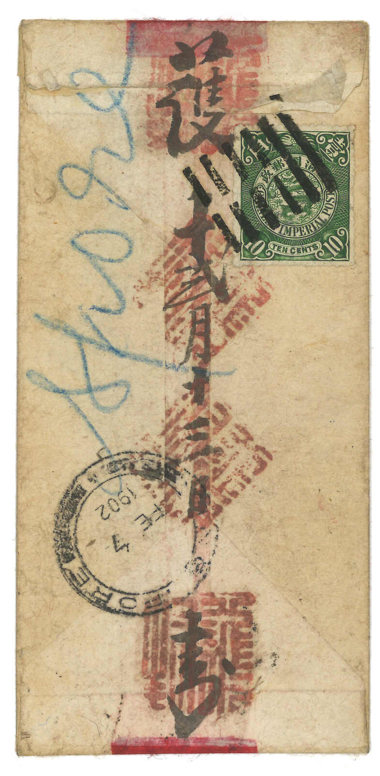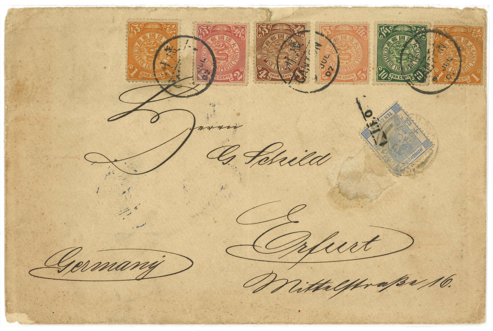 1902.7.9 廣州寄德國,貼蟠龍6枚合2角2分,銷廣州半切漢英日戳。加貼香港維多利亞女皇像10仙,銷廣州Webb 2型IPO騎縫戳及7.10維多利亞日戳。8.8抵Erfurt。2007.11 蘇黎世亞洲,拍品號1327。(Image 1)
