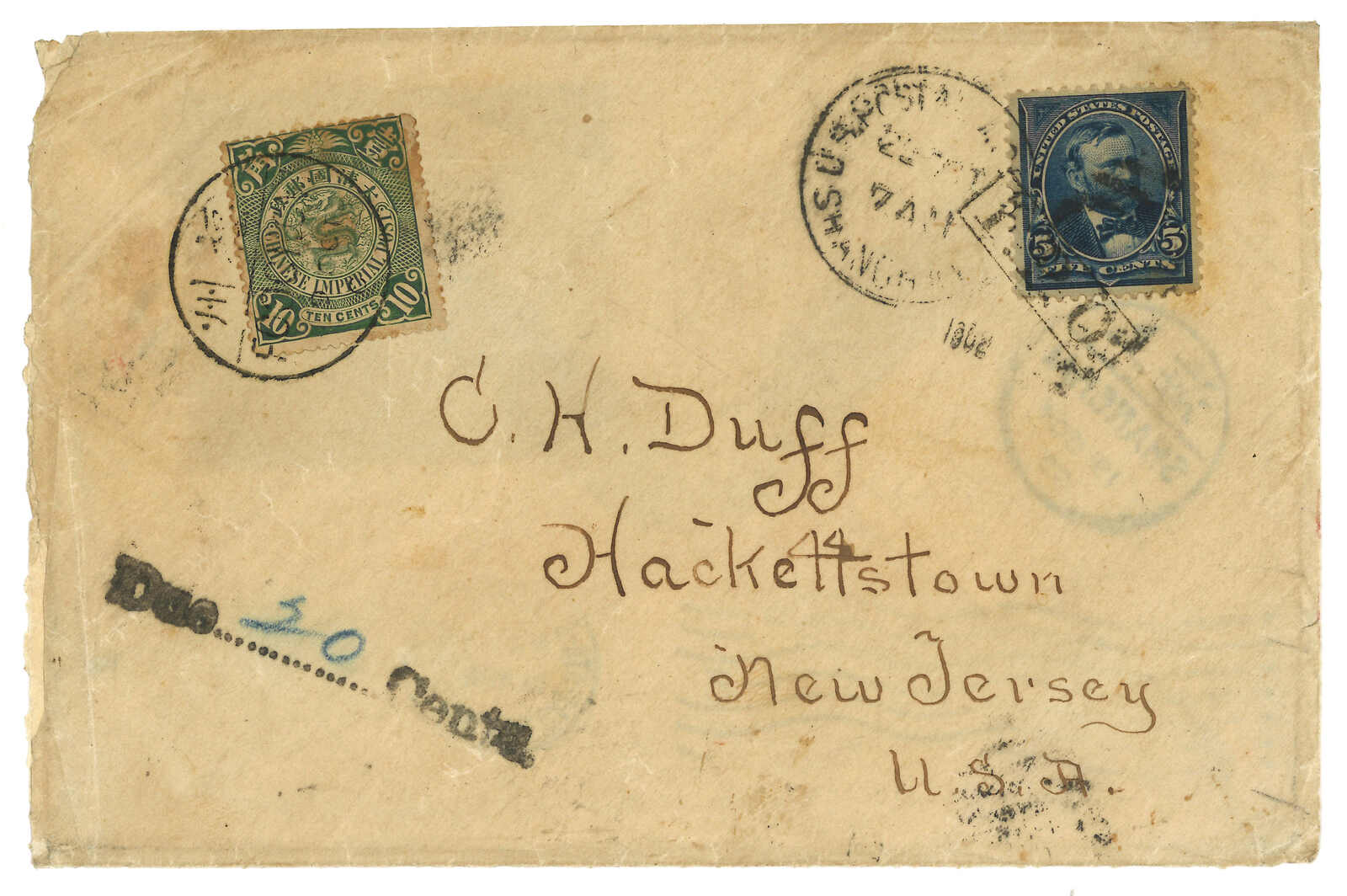 福州寄美國,貼蟠龍1角,銷福州半切漢英日戳。10.19經上海清郵。加貼美國票5分,銷福州IPO騎縫戳及上海美國郵政代理雙聯日聯。11.14經三藩市。因超重而鈐美國20分欠資章,背貼美國欠資票5分四方連。IPO騎縫戳蓋於美國票而非港英票之極少見例子,欠資更是有趣。(Image 1)