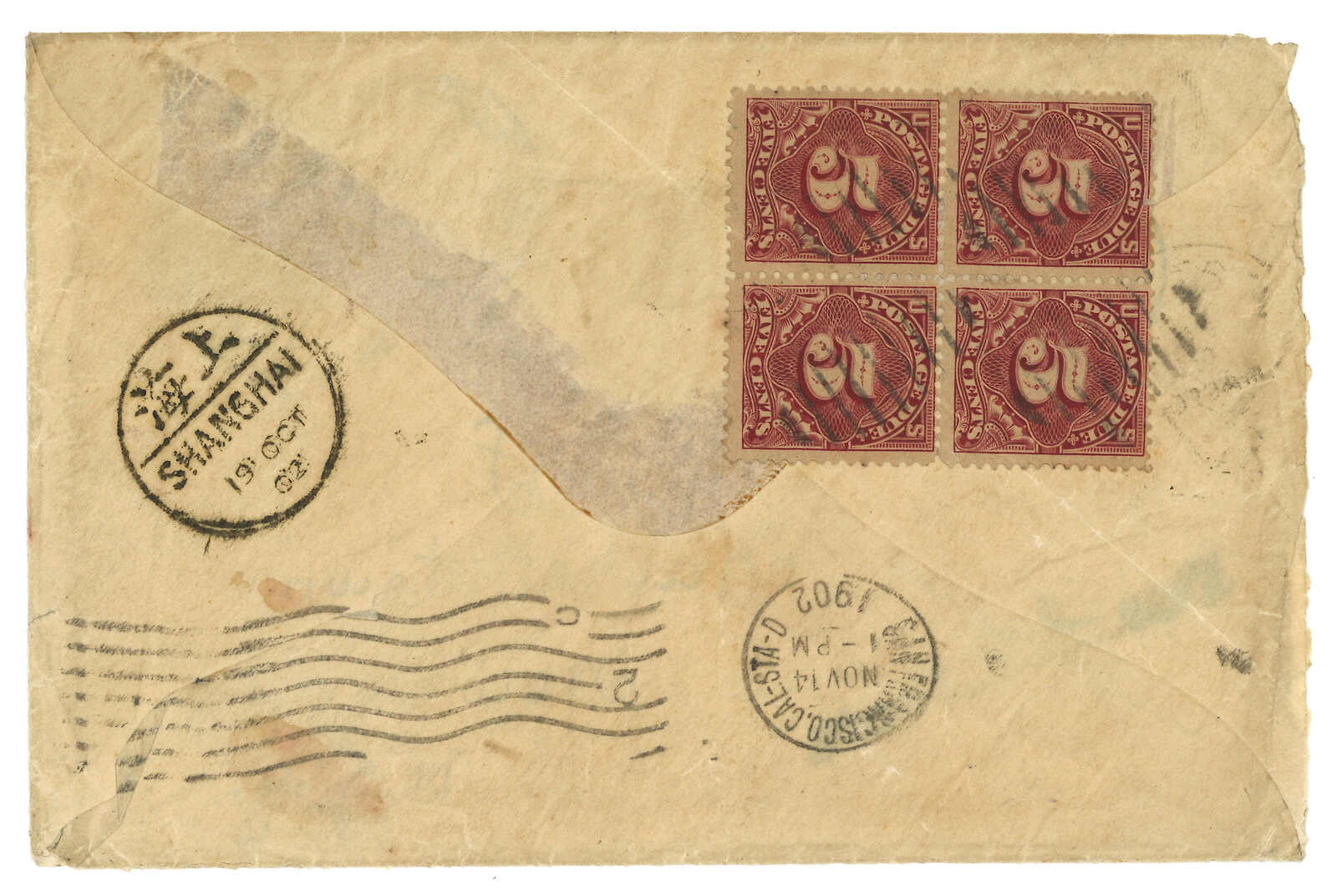 Transit San Francisco (14 Nov). Applied with US 20c due mark because of overweight. F.w. US postage due 5c in block of 4 on reverse. Very scacrce example of IPO on US instead of Hong Kong issues, not to mention a taxed example.