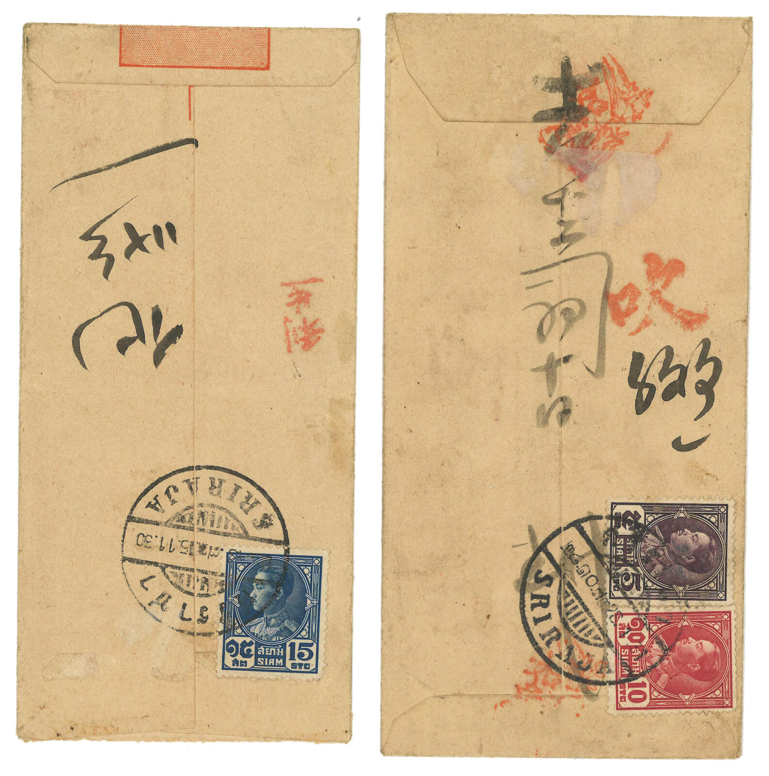 1930 a pair of remittance red band covers from Sriraja to Swatow, f.w. Rama VII issues for 15 stg, tied by Sriraja cds. Both with prefix and serial no. With original letter.