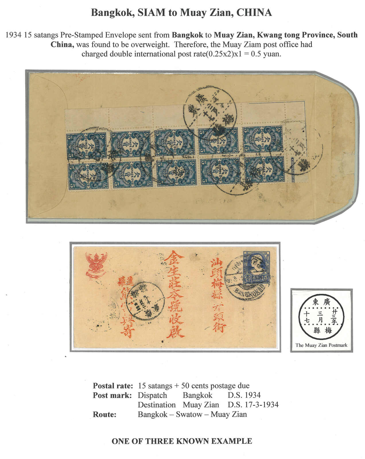1934 Bangkok to Meihsien. Siam 15 stg stationery cover, tied by Bangkok cds. In combination with ROC postage due 5c in block of 10 on reverse, tied by Kwangtung Meihsien cds (17 Mar) upon arrival. This cover was found enclosing