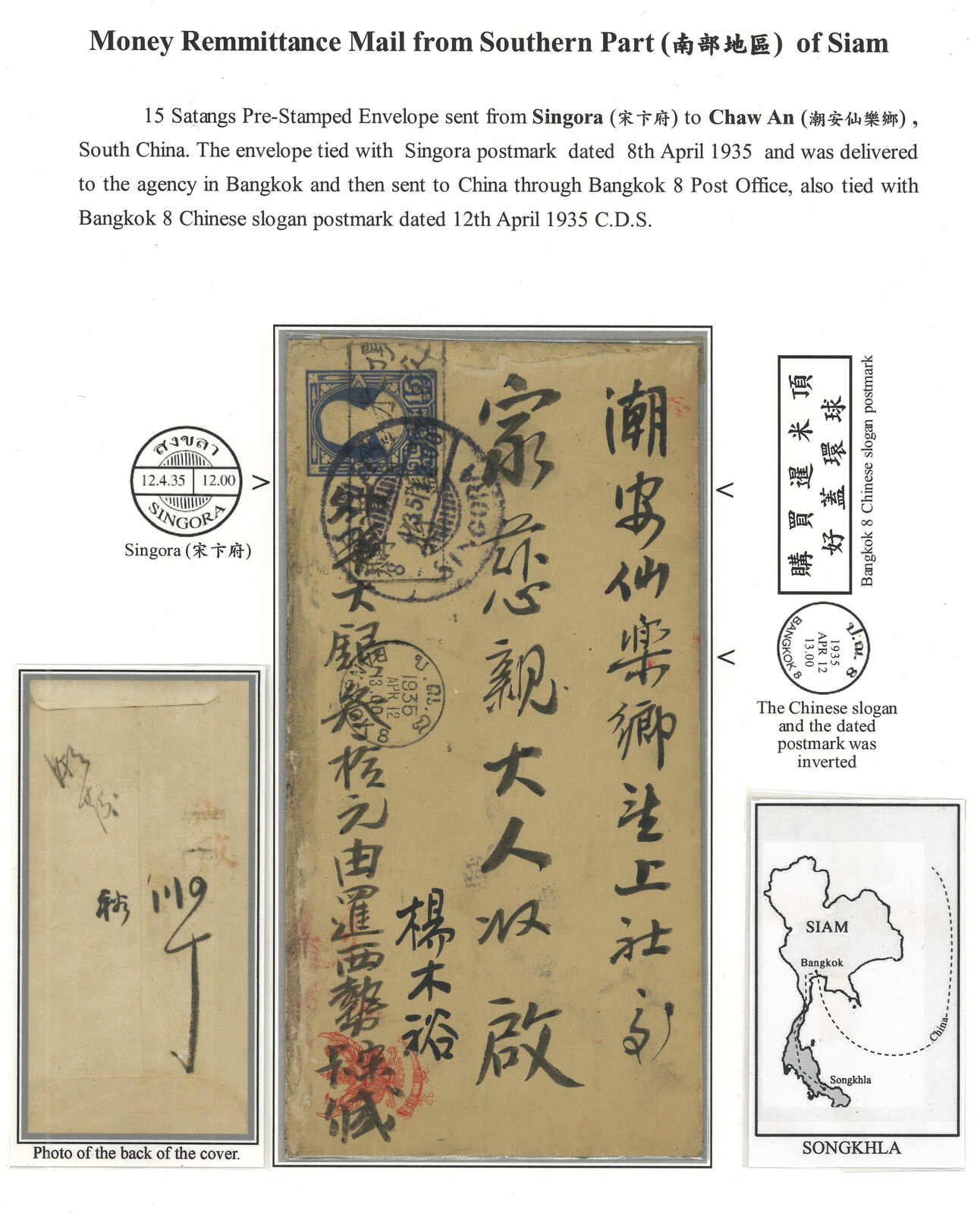 1935年暹羅15士打郵資封,自宋卡寄潮安,銷宋卡日戳及曼谷8局“購買暹米頂好蓋 環球”宣傳機戳。背面寫有字軌及序號。出自暹羅南部僑批例子罕。(Image 1)