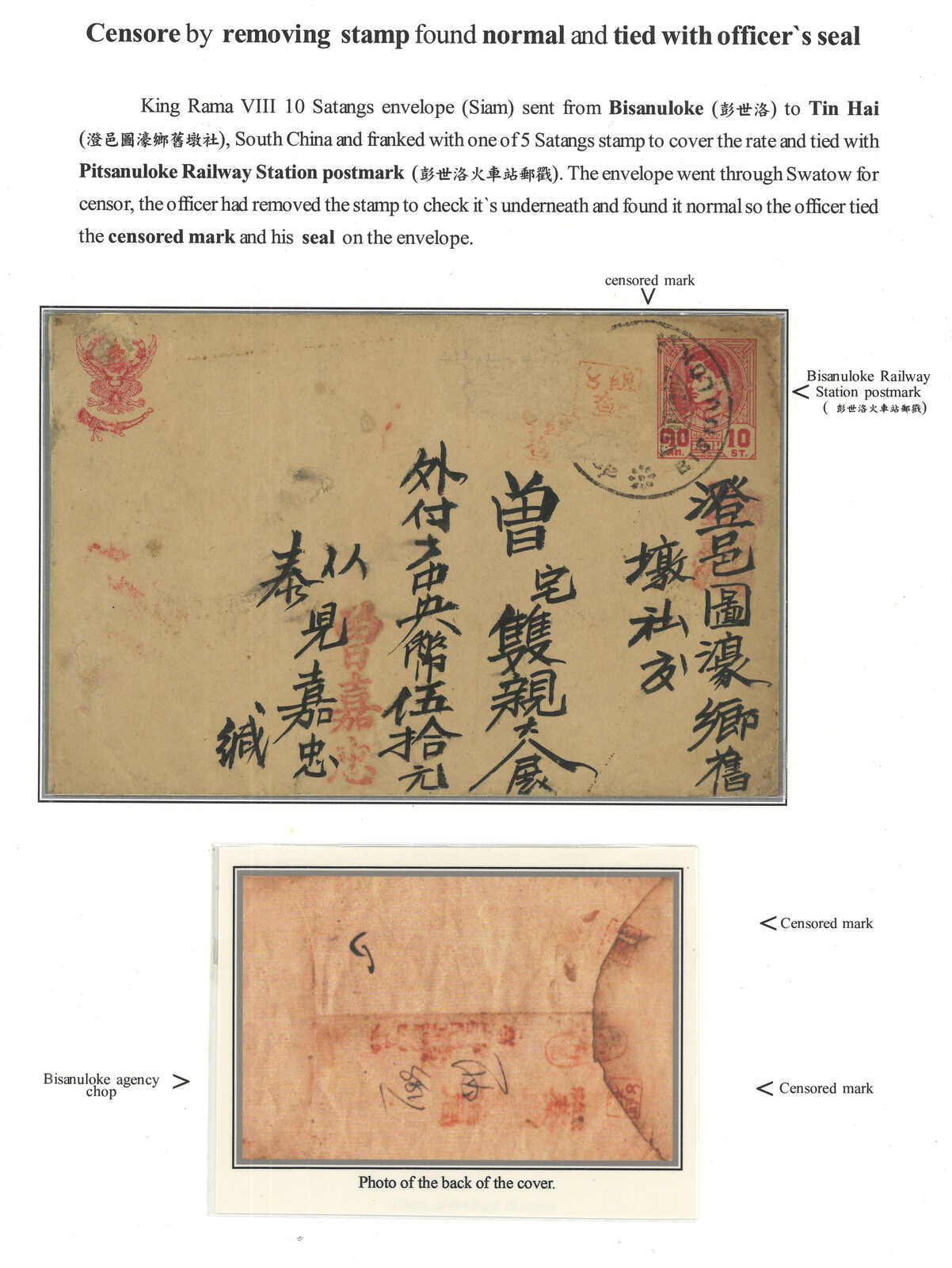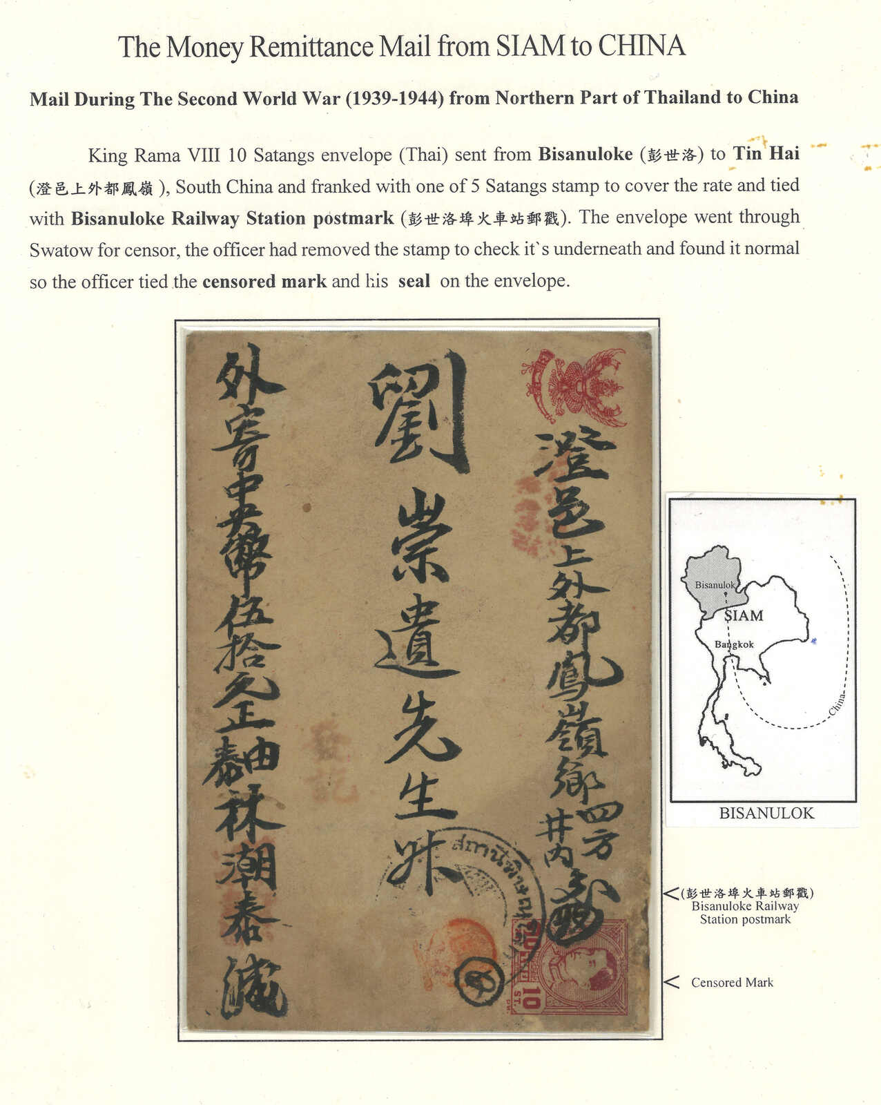 1940年代暹羅10士打郵資封,自彭世洛寄澄海,加貼5士打,銷彭加洛火車郵局日戳。5士打票 被揭起檢查,鈐檢查章。許茂春著《東南亞華人與僑批》第86頁1-197原件。(Image 1)