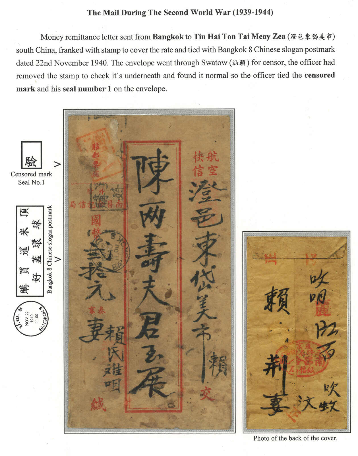 1937年暹羅15士丁郵資封,自洛坤北汶浪寄潮安,鈐北汶浪日 戳。8.10經曼谷8局。鈐批局宣傳戳記及“中央”戳記。1929 年,暹羅郵政發行15士打郵資封供僑批使用。出自暹羅南部例 子罕。(Image 1)