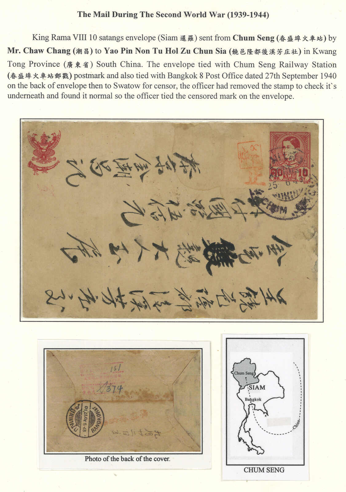 1940 Siam 10 stg stationery cover from Chum Seng (27 Sep) to Jaoping, uprated by 5 stg, tied by Chum Seng Railway Station cds. Transit Bangkok 8 PO (27 Sep). Showing Qiaopiji remittance mark on reverse. 5 stg stamp removed for