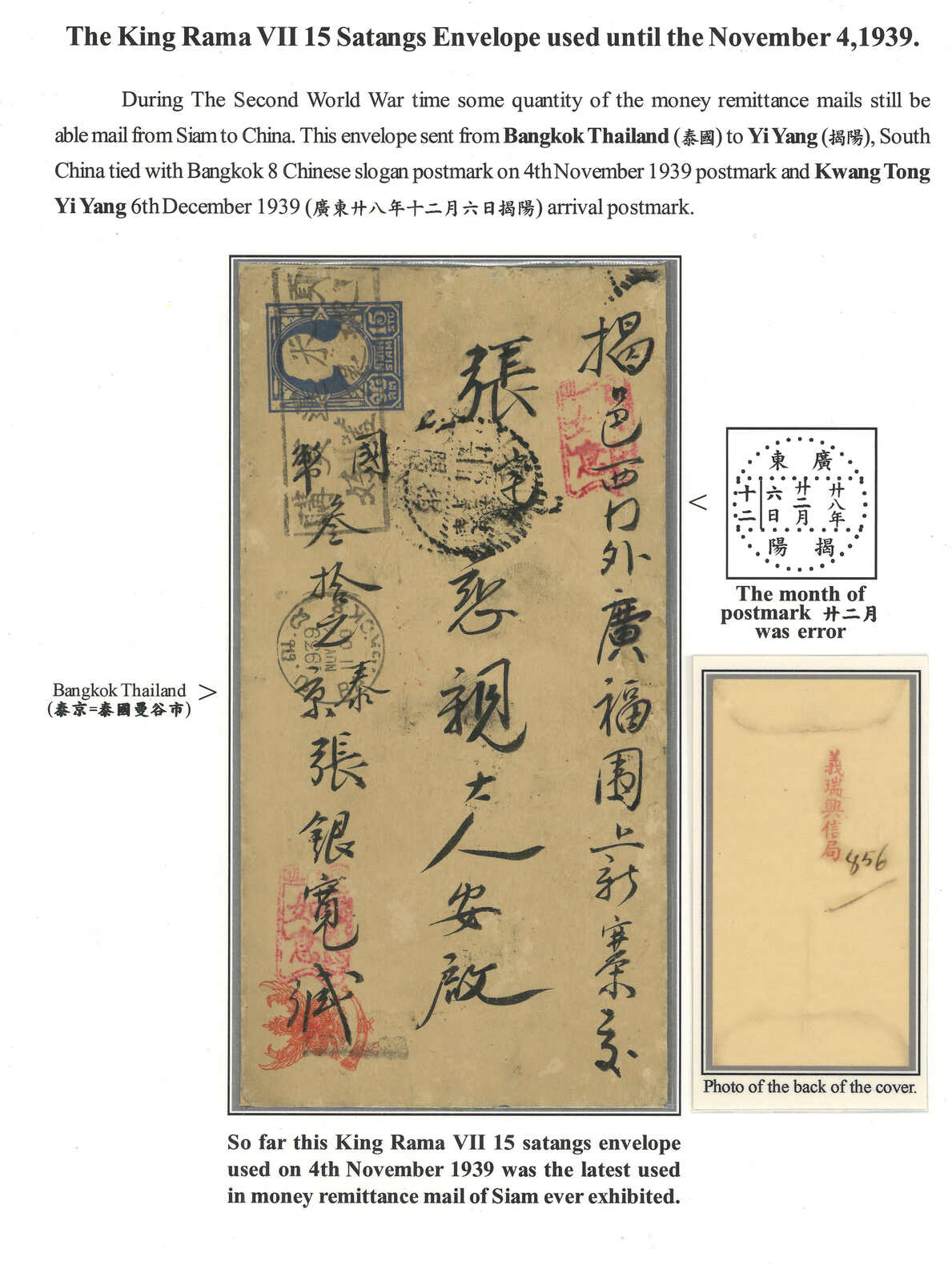 1939.11.4 暹羅15士打郵資封寄揭陽,鈐曼谷8局大米宣傳機戳。背面蓋有“義瑞興信局”直戳。 此為記錄中最晚之15士打郵資封僑批。許茂春著《東南亞華人與僑批》第78頁1-171原件。(Image 1)