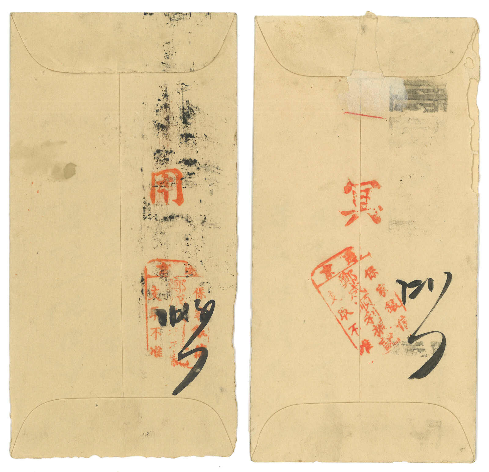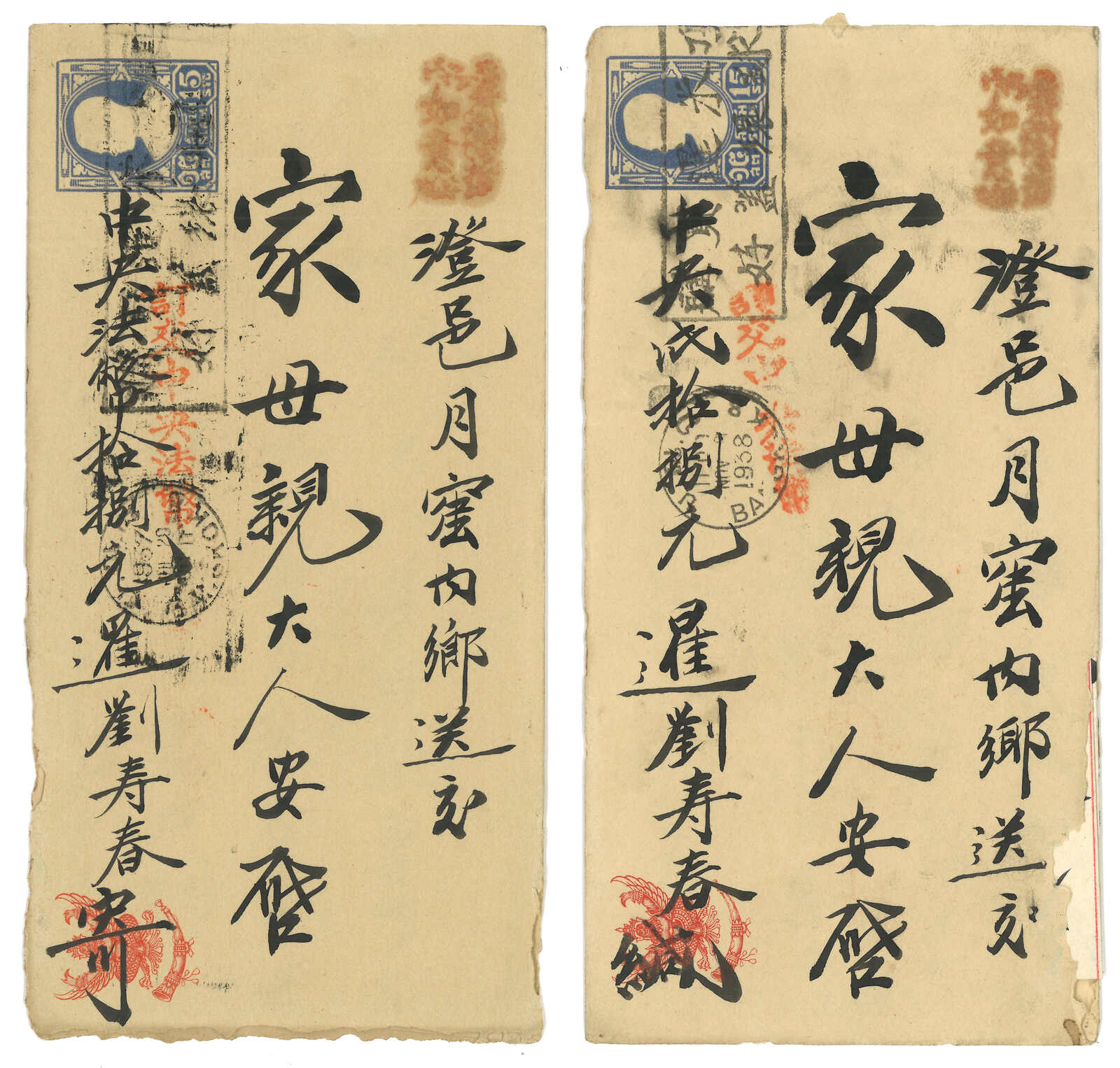 1937 and 1938 a pair of 15 stg stationery covers to the same addressee in Tenghai, both tied by Bangkok 8 rice-selling meter stamp, alongside with “Submitted in CNC” cachet. On reverse with Qiaopiju cachet. With original