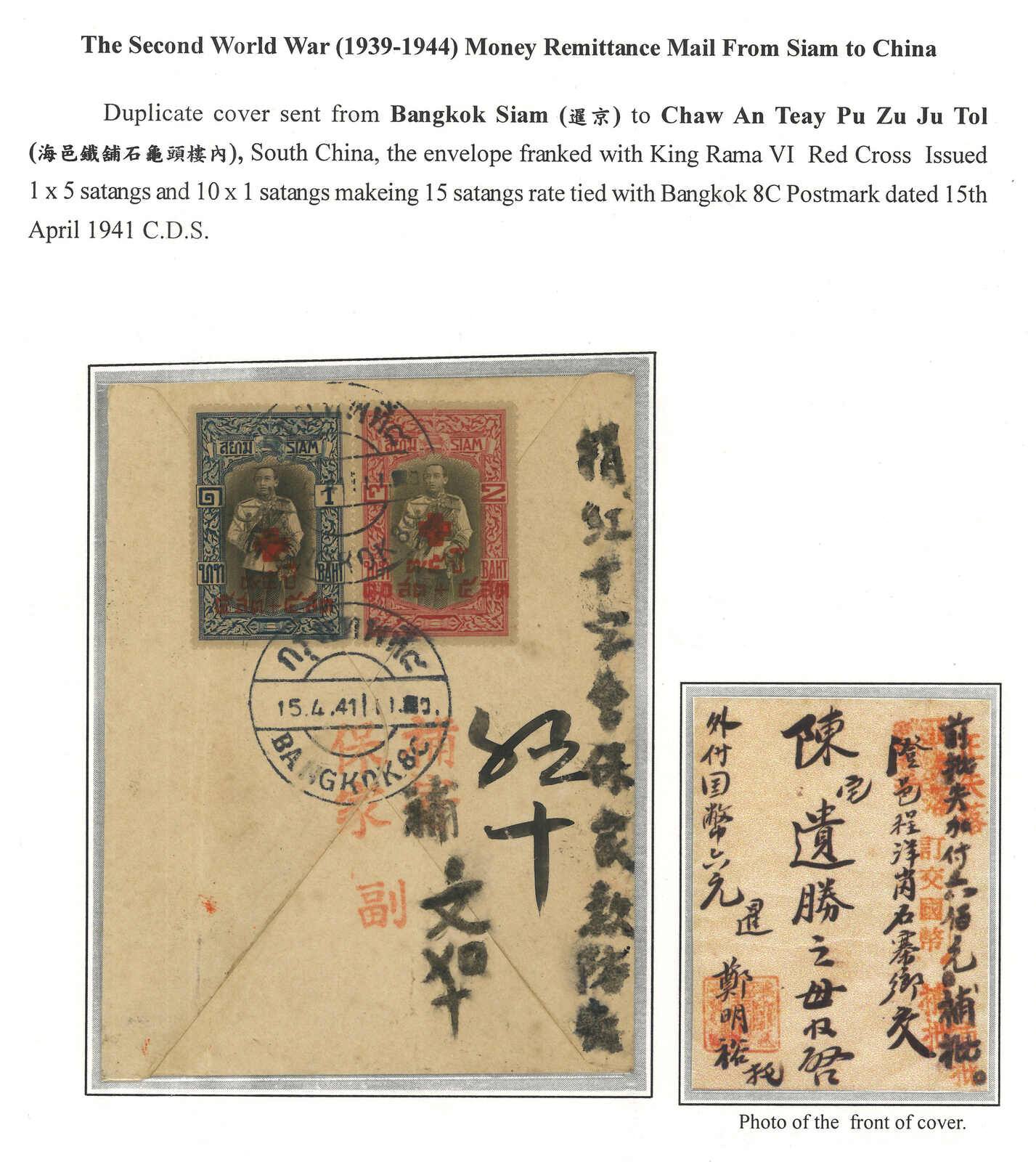 1941 (15 Apr) Remittance duplicate cover to Tenghai, f.w. 75th Anniv of Red Cross surch 5 stg + 10 stg, tied by Bangkok 8C cds. Alongside with prefix and serial number. Rare example of duplicate cover, not to mention f.w. Red