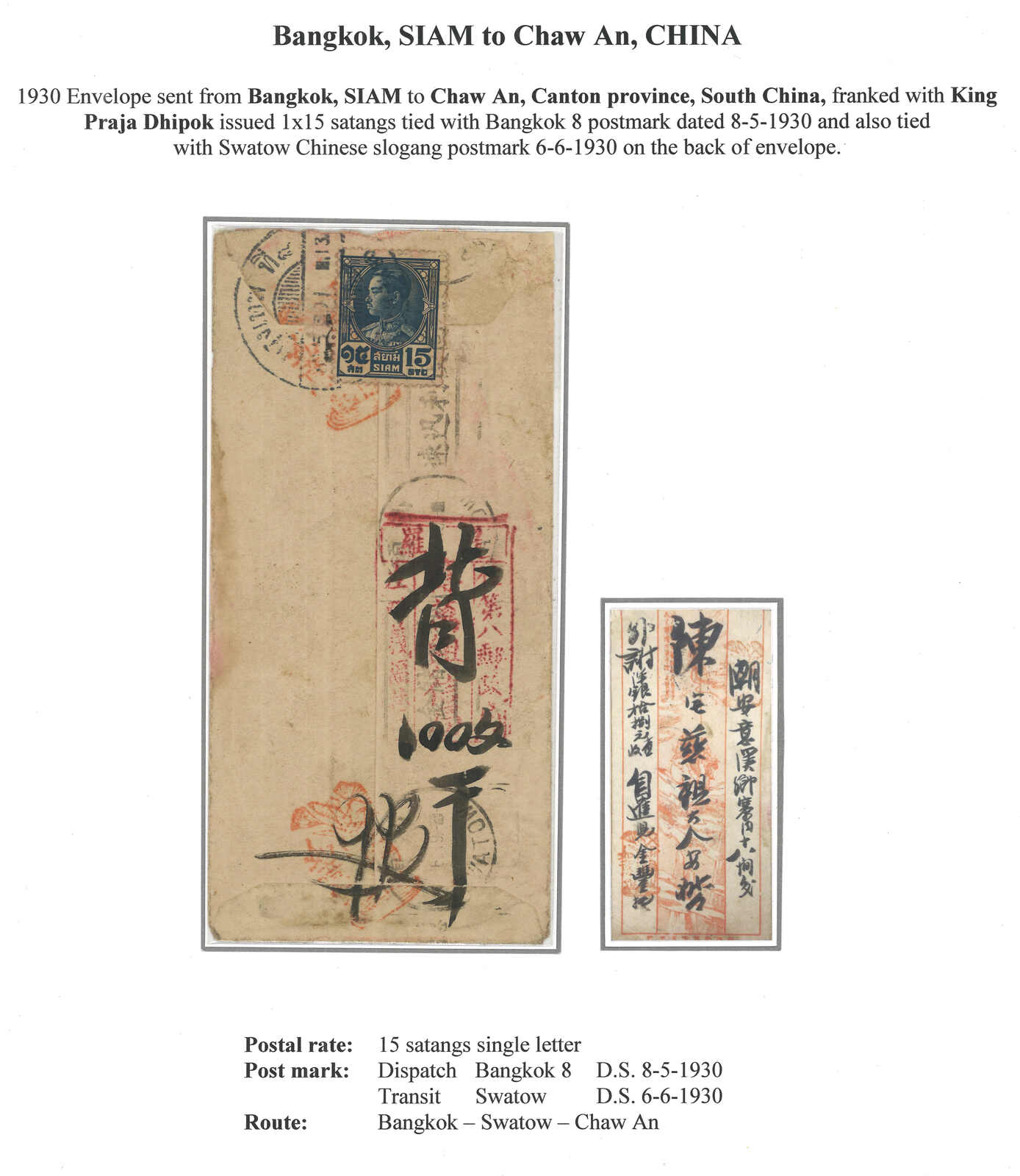 1930.5.8 曼谷寄潮安,背貼拉瑪七世15士打,銷曼谷8局日戳,旁鈐“暹羅得萬興信 局”地址戳。6.6抵汕頭,鈐郵政儲金機戳。該信局位於第八郵政局左畔義福巷口。(Image 1)