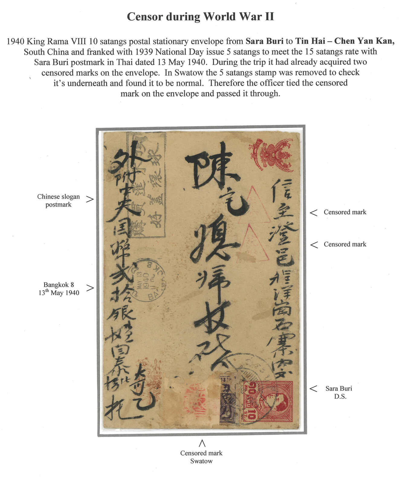 1940 (13 May) Siam 10 stg stationery cover from Sara Buri to Tenghai, uprated by 5 stg, tied by Sara Buri cds. Transit Bangkok 8 PO (13 May) with rice-selling promotional meter stamp. 5 stg stamp removed afterward for censor