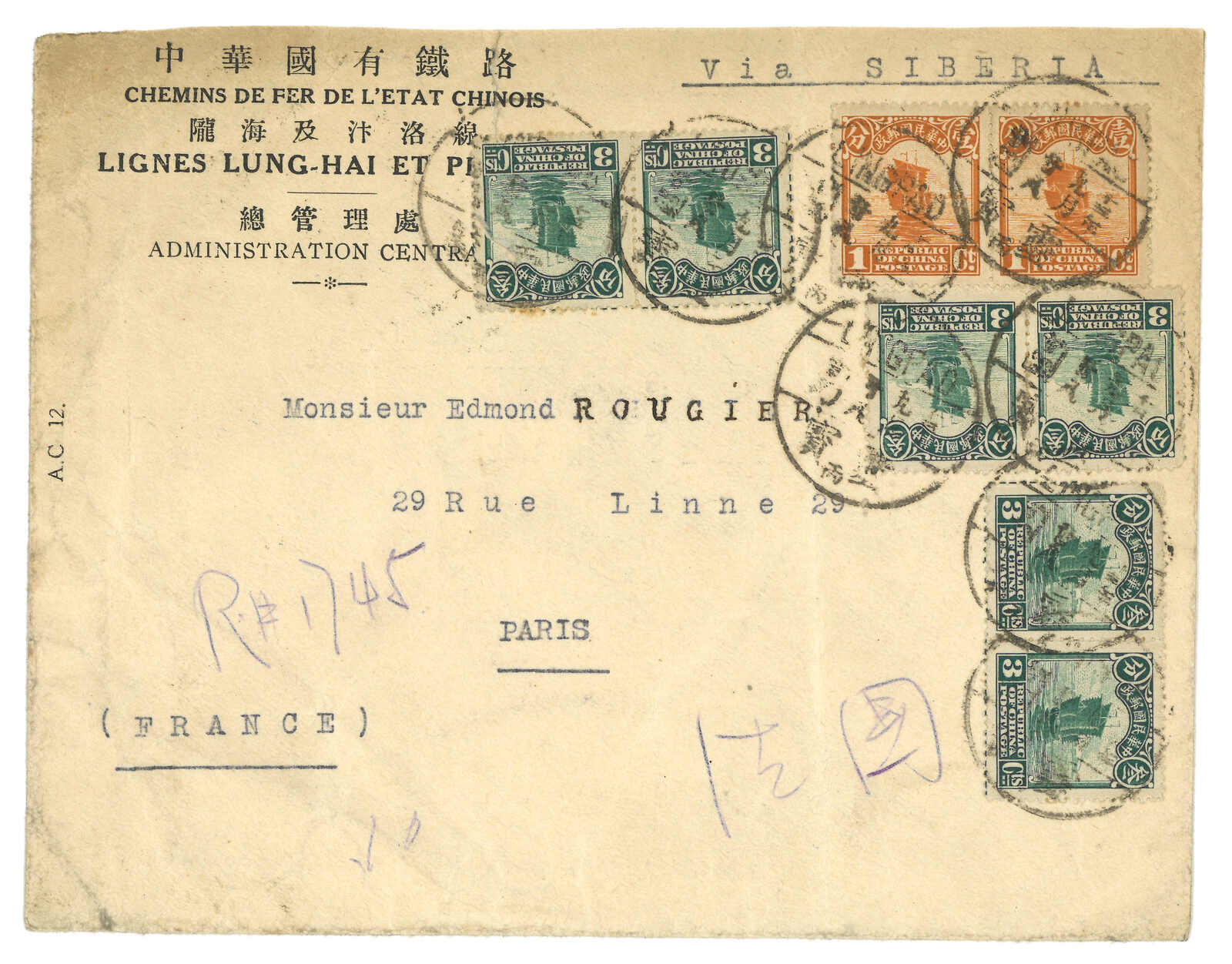 250 cover image1926 (28 Sep) Lunghai-Pienloh Railway Administration Centre cover from Lingpao to France, f.w. Junk 1c in pair + 3c x6, tied by Lingpao bilingunal cds. Transit Peking (8 Oct). Arrived Paris.