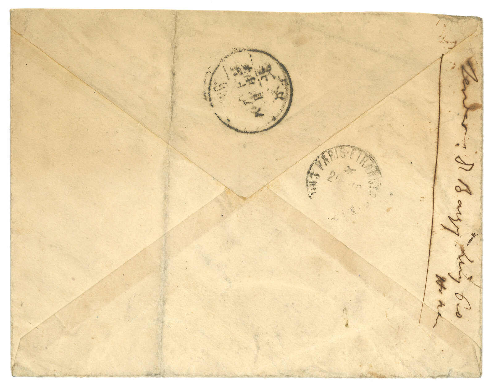 1847.9.11 雲南府寄法國。郵簡,寫有“via Southampton”、“1/10”英國郵資及“15”法國郵資,鈐Webb B型“COLONIES & c A.R.T. 13”計費戳記。11.27經香港,1.30經倫敦。抵巴黎。此為雲南最早之國際出口封,由傳教士寄出。 2008.12 Interasia拍品號594。 馬蘭茂著《雲南郵政史1901-1949》第19頁圖一原件。 2020年8月《今日郵政》752期第22頁原件。 2019年中泰聯合郵展特刊第67頁原件。(Image 1) (All Images)