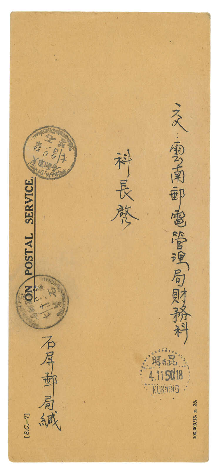 1950.11.4 石壁鐵路火車郵局寄昆明。郵政公事封,鈐石碧火車郵局日戳。11.4抵昆明。(Image 1) (All Images)