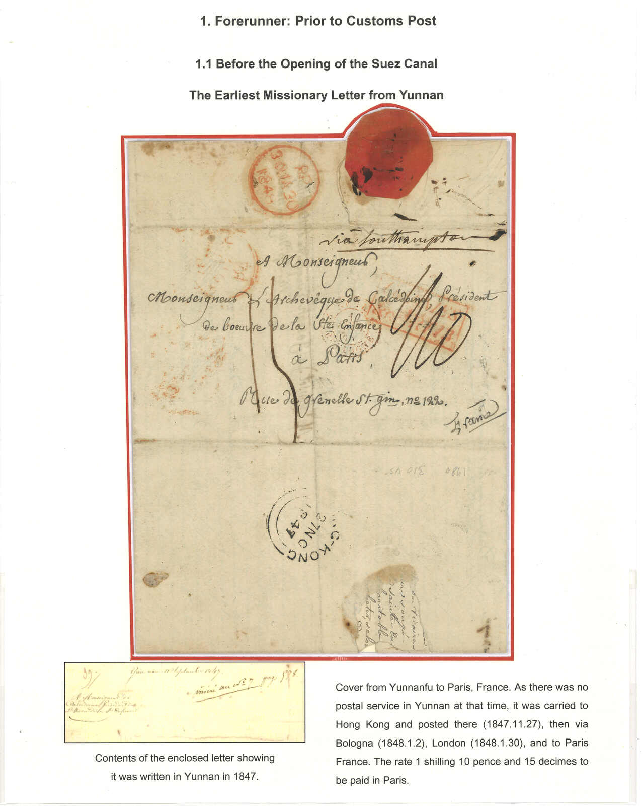 601 cover image1847 Yunnanfu (11 Sep) to France. Entire letter, sent "via Southampton" and rated "1/10", "15", applied with Webb type B "COLONIES & c. A.R.T. 13" accountancy mark on front. Transit Hong Kong (27 Nov), London (30 Jan), Arrived Paris. It is the earliest outgoing mail from Yunnan, sent by missionary. Historical. 2008 (6-7 Dec) Interasia lot. 594. Illustration 1, p. 19 in "The Development of Yunnan Postal System 1901-1949" by Mah Lang Moe. 2019 ROCUPEX TAIPEI & R.O.C.-Thailand Stamp Exhibition. 2020 (Aug) "Postal Service Today / Republic of China" Issue 752 p. 22 illustration.