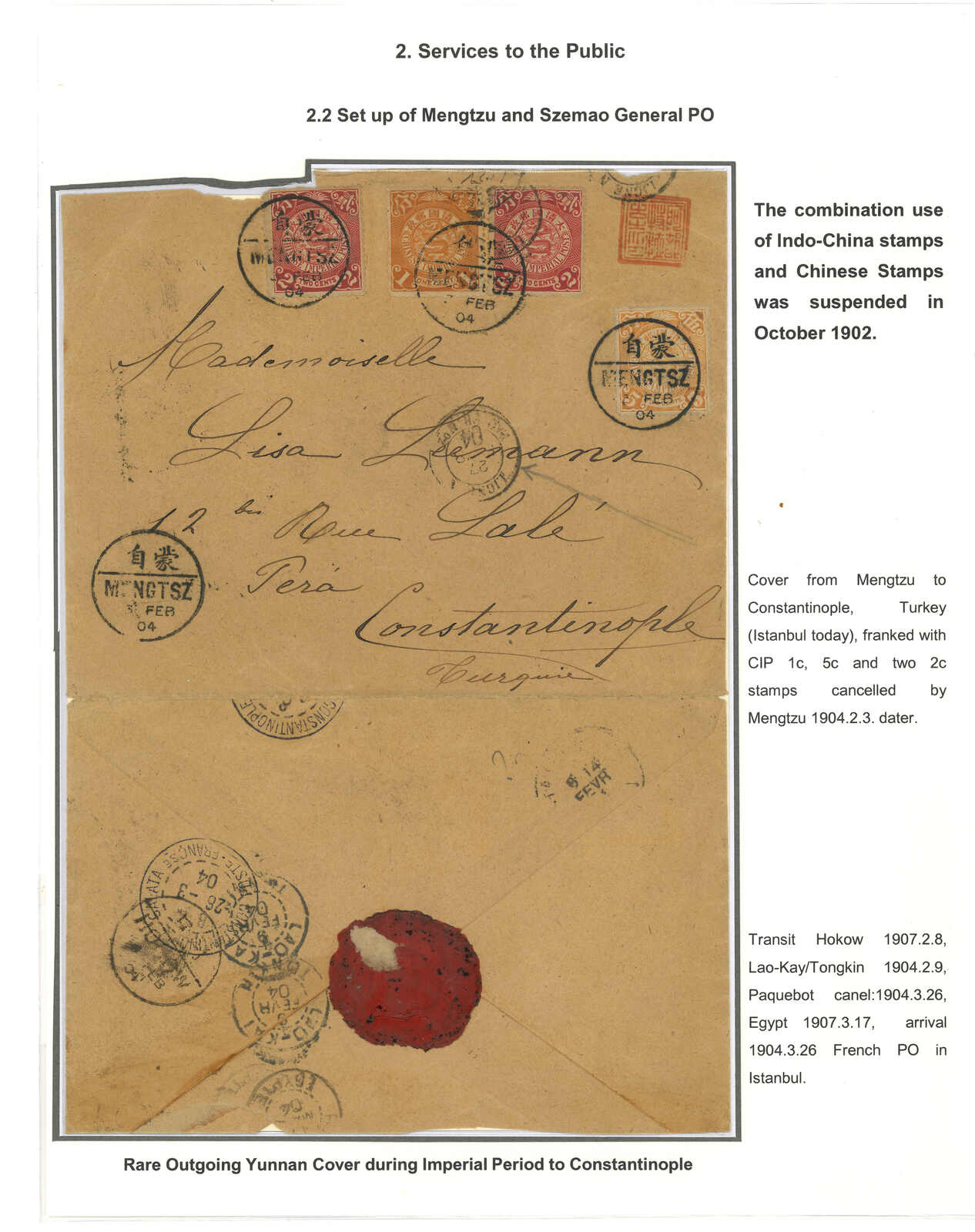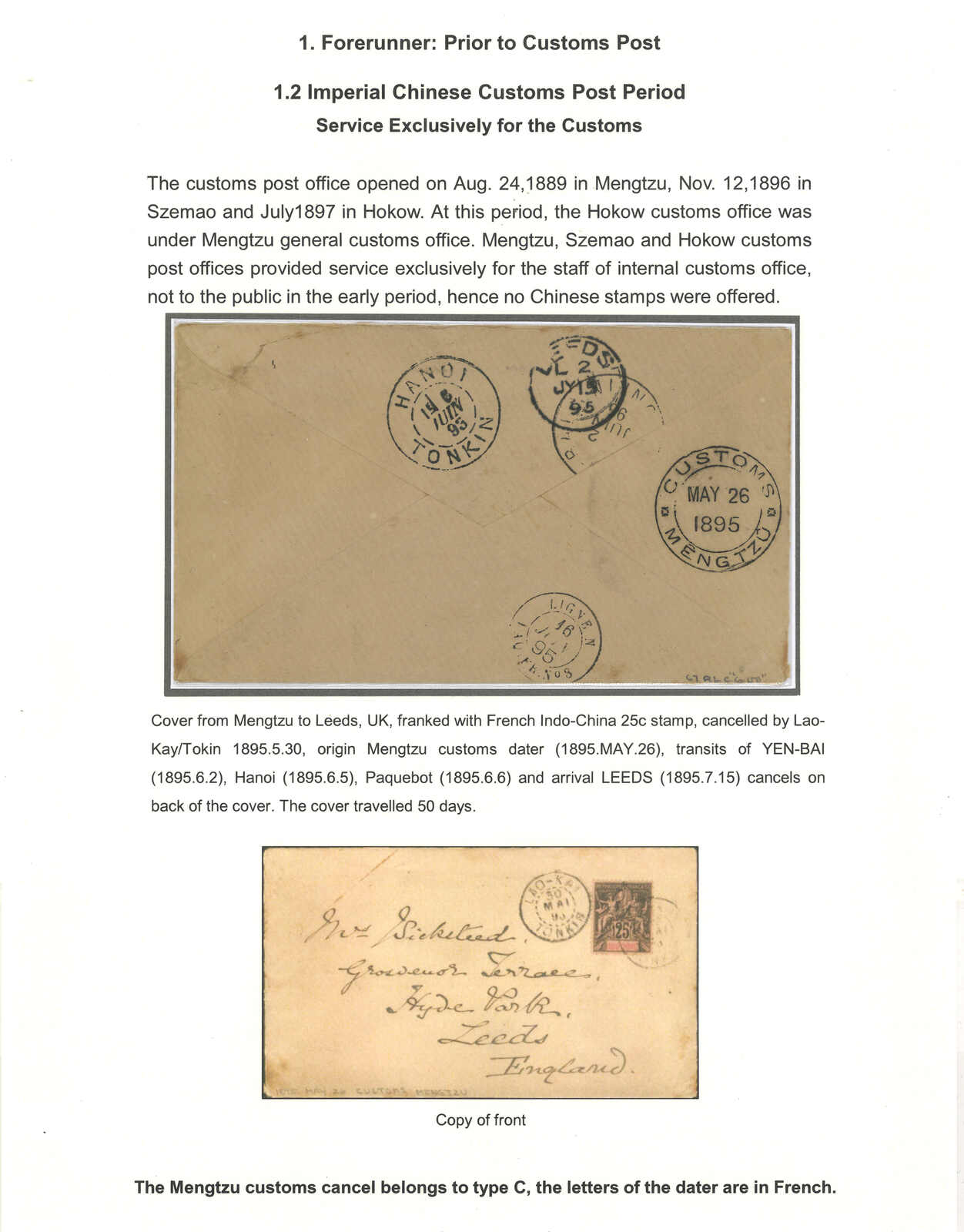 602 cover image1895 Mengtzu (26 May) to England, applied with Customs Mengtzu origin cds on reverse. In combination with French Navigation and Commerce issue 25c on front, tied by Laokay (30 May) cds. Transit Yen Bai (2 Jun), Hanoi (5 Jun), French paquebot (16 Jun). Arrived Leeds (15 Jul). Customs Post was only available for internal mails so no Chinese franking was required. Illustration 4, p. 21 in "The Development of Yunnan Post System 1901-1949" by Mah Lang Moe. 2012 China Stamps Society Inc. ROC Chapter illustration. 2019 ROCUPEX TAIPEI & R.O.C.-Thailand Stamp Exhibition. 2020 (Aug) "Postal Service Today / Republic of China" Issue 752 p. 22 illustration.