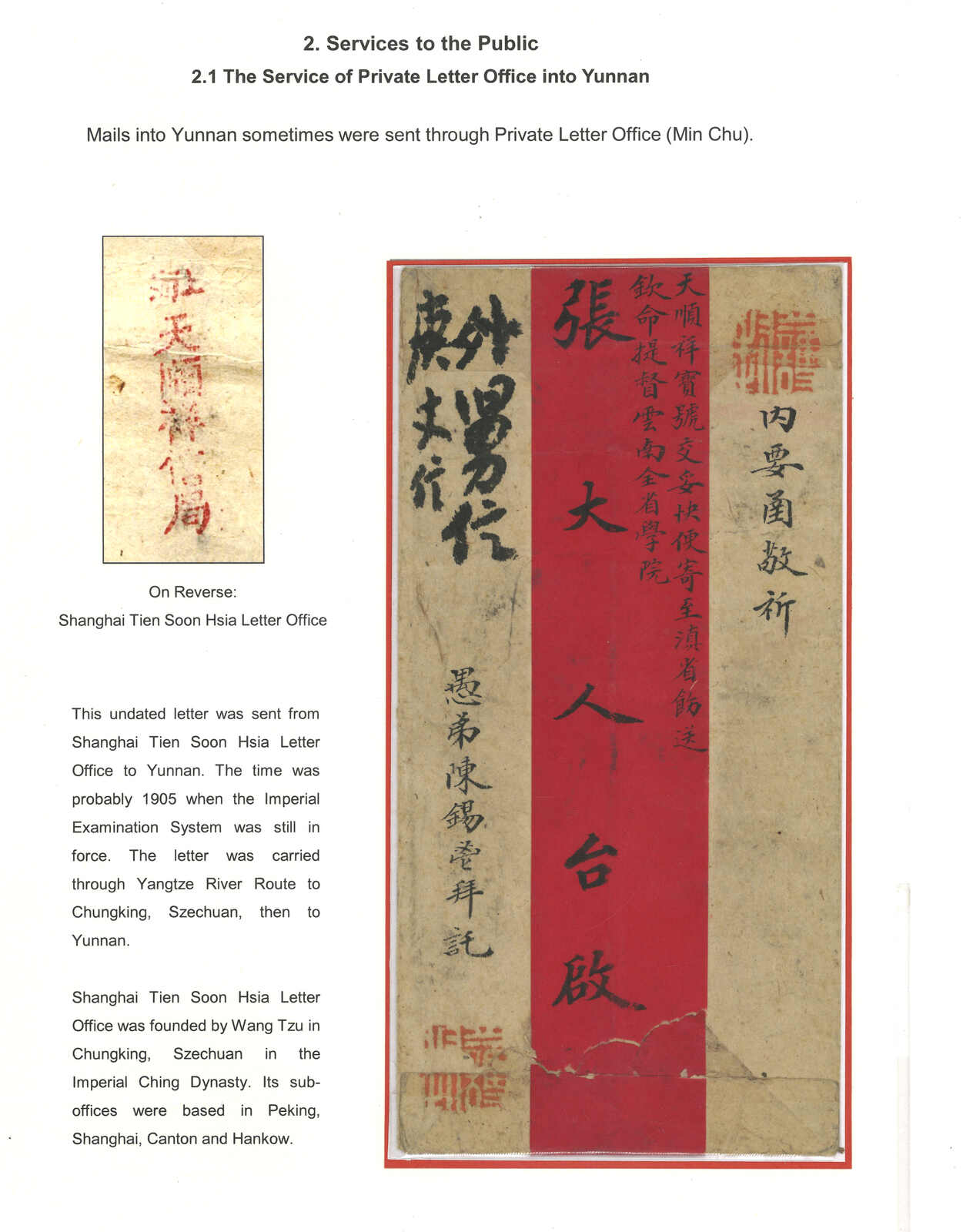 清代紅條封自上海經民信局寄雲南府,背鈐上海天順祥信局直戳。經重慶抵雲南府。寄件人陳錫鬯為四川官員,收件人為雲南省最高教育行政長官。天順祥信局由上海商人王熾創立,總號位於重慶。當時海關郵政未收寄公眾郵件。 馬蘭茂著《雲南郵政史1901-1949》第20頁圖二原件。 2019年中泰聯合郵展特刊第67頁原件。 2020年8月《今日郵政》752期第22頁原件。(Image 1) (All Images)