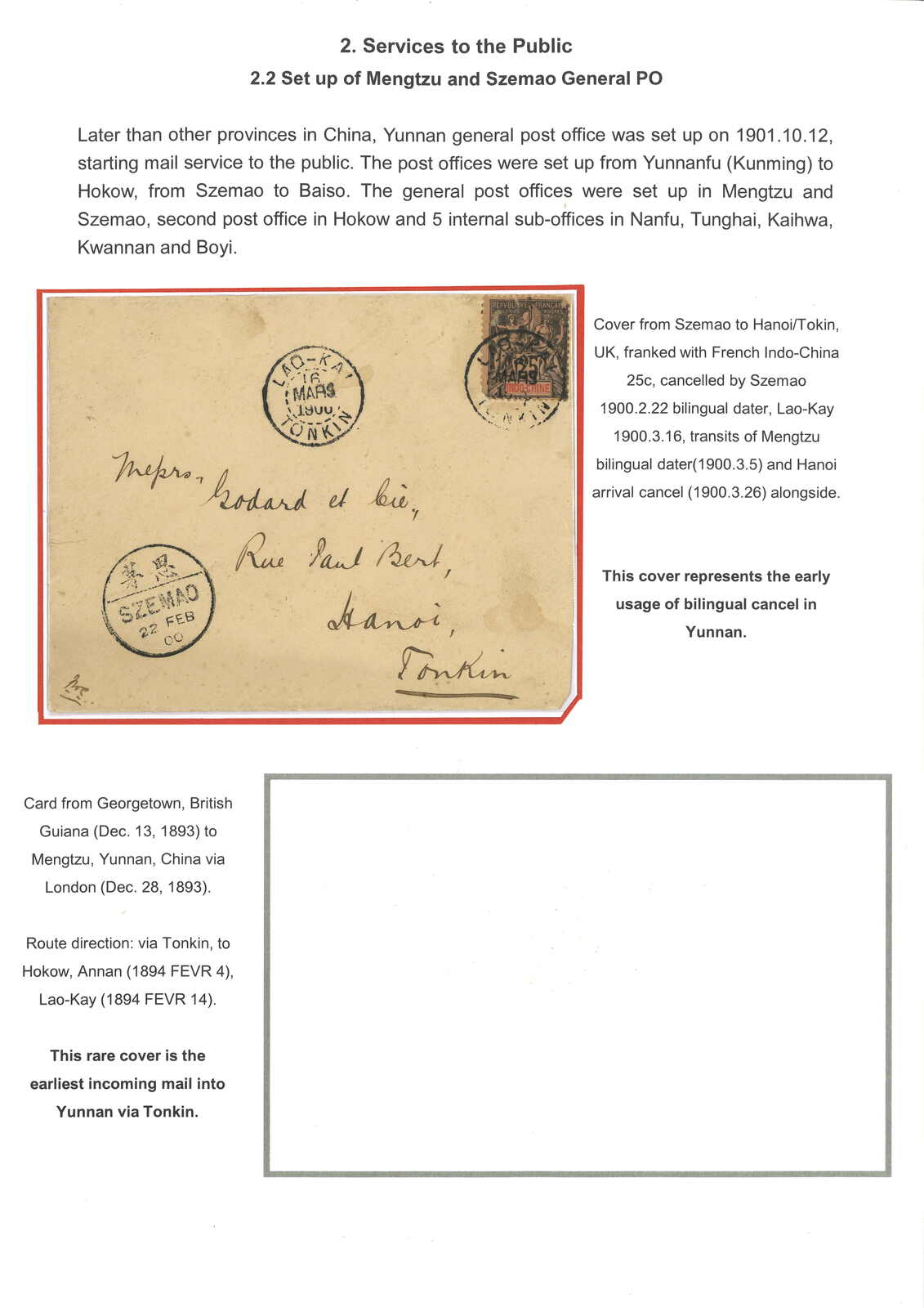 604 cover image1900 Szemao (22 Feb) to Tonkin, applied with Szemao bisected bilingual cds. In combination with Navigation and Commerce issue 25c, tied by Laokay (16 Mar) cds. Early usage of bisected bilingual cds in Yunnan mail. Illustration 5, p. 21 in "The Development of Yunnan Post System 1901-1949" by Mah Lang Moe. 2019 ROCUPEX TAIPEI & R.O.C.-Thailand Stamp Exhibition. 2020 (Aug) "Postal Service Today / Republic of China" Issue 752 p. 22 illustration.