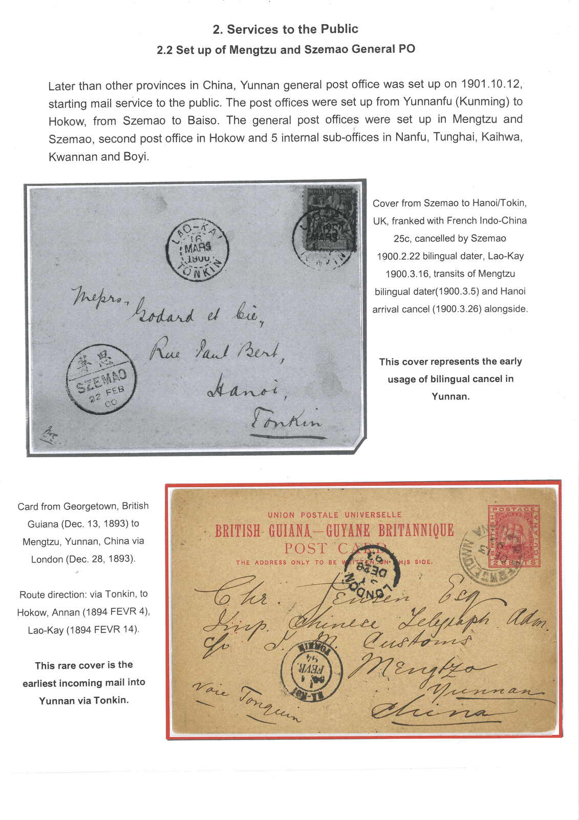 605 cover image1893 (13 Dec) British Guiana 2c PSC from George Town to Customs Mengtsz, tied by George Town cds. Transit London (28 Dec), Hanoi (4 Feb), Laokay (14 Feb). It is the earliest incoming mail to Yunnan via Tonkin. Scarce. Illustration 3, p. 21 in "The Development of Yunnan Post System 1901-1949" by Mah Lang Moe. 2019 ROCUPEX TAIPEI & R.O.C.-Thailand Stamp Exhibition. 2020 (Aug) "Postal Service Today / Republic of China" Issue 752 p. 22 illustration.