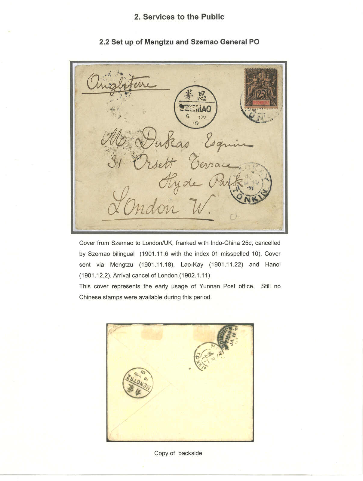 606 cover image1904 Szemao (6 Nov) to England, applied with Szemao bisected bilingual cds (with wrong year "10" instead of "01"). Transit Mengtsz (18 Nov). In combination with Navigation and Commerce issue 25c, tied by Laokay (22 Nov) cds. Further transit Hanoi (2 Dec). Arrived London (11 Jan). Early example since Imperial Post was established in Yunnan. Stamps, however, were not yet available. Illustration 6, p. 22 in "The Development of Yunnan Post System 1901-1949" by Mah Lang Moe. 2019 ROCUPEX TAIPEI & R.O.C.-Thailand Stamp Exhibition. 2020 (Aug) "Postal Service Today / Republic of China" Issue 752 p. 22 illustration.