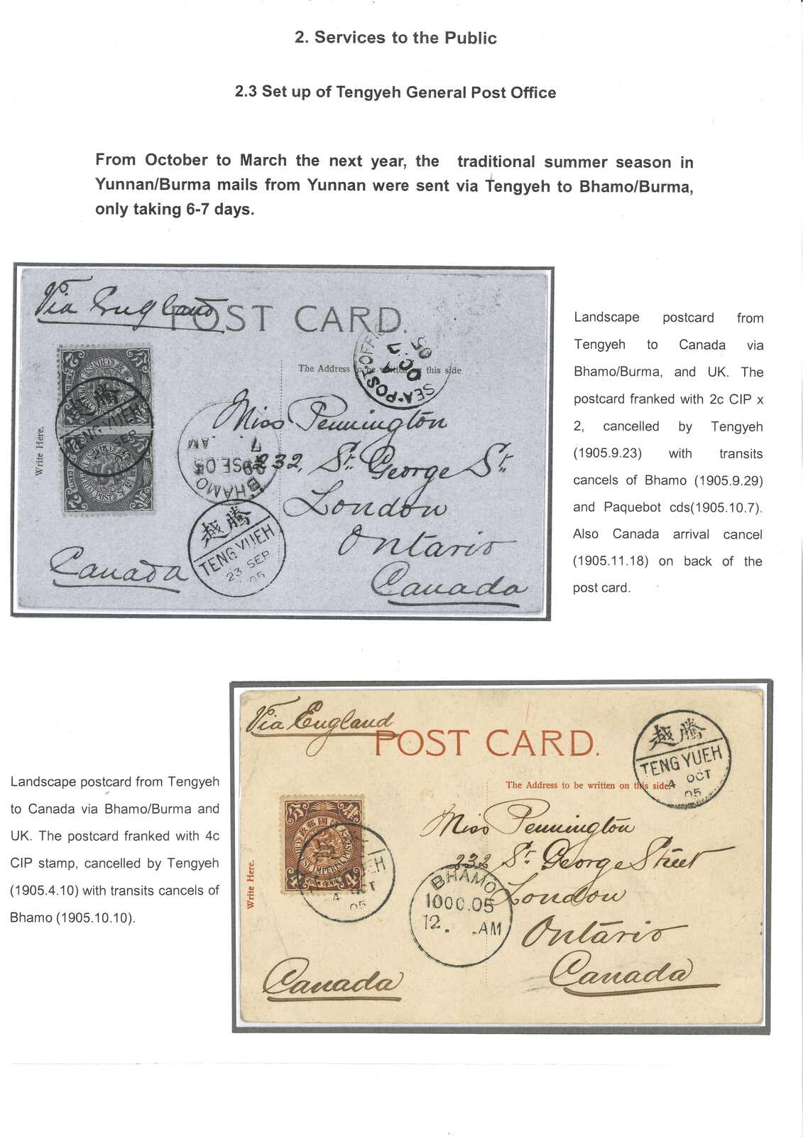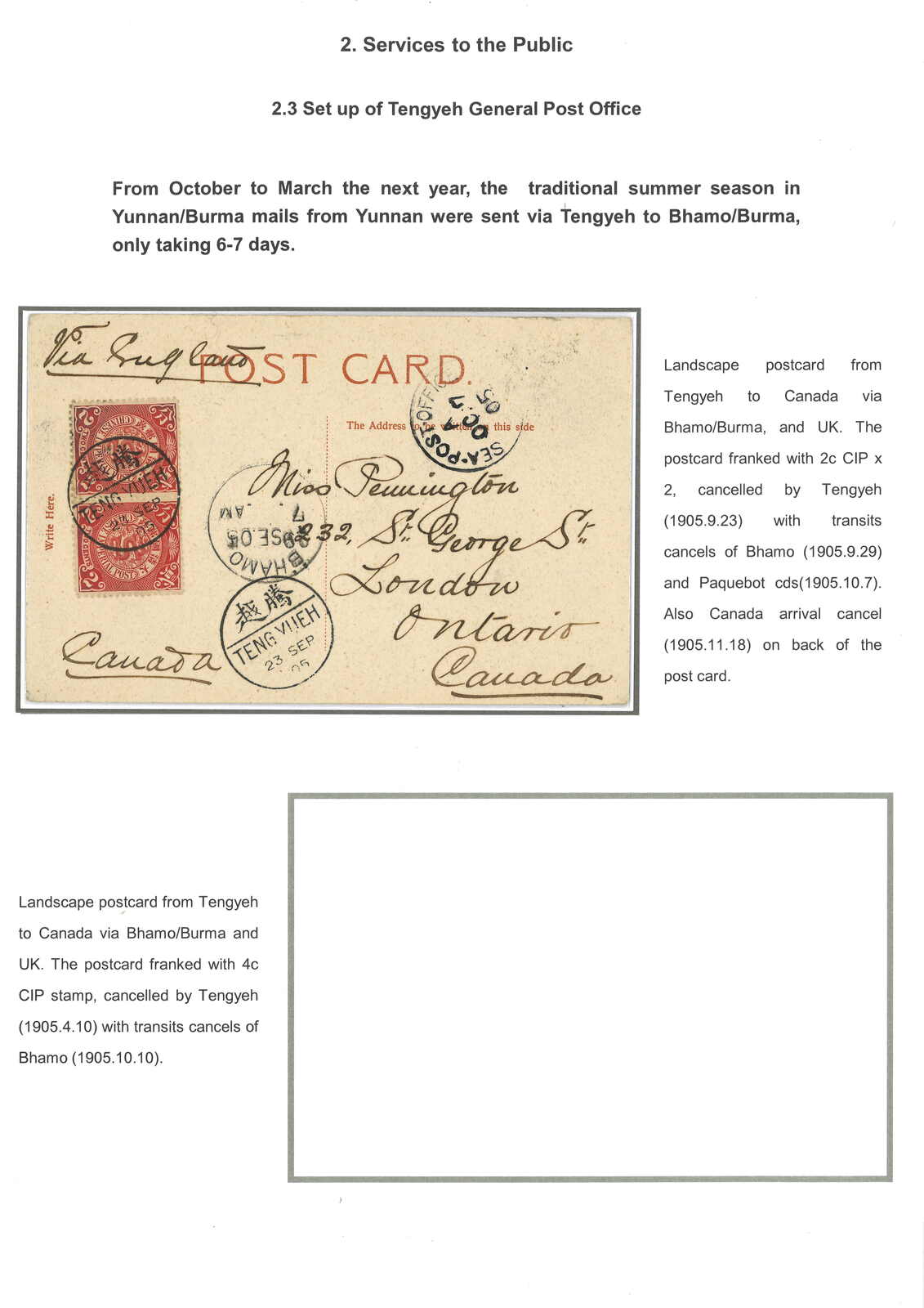 608 cover image1905 Tengyueh (23 Sep) to Canada. View PPC, f.w. Coiling Dragon 2c in pair for 4c international postcard rate, tied by Tengyueh bisected bilingual cds. Transit Bhamo (29 Sep), Sea Post Office (7 Oct). Arrived Canada (18 Nov). Since 1904, combination franking with Indian stamps was not required on mails via Bhamo thanks to Sino-Indian postal convention.