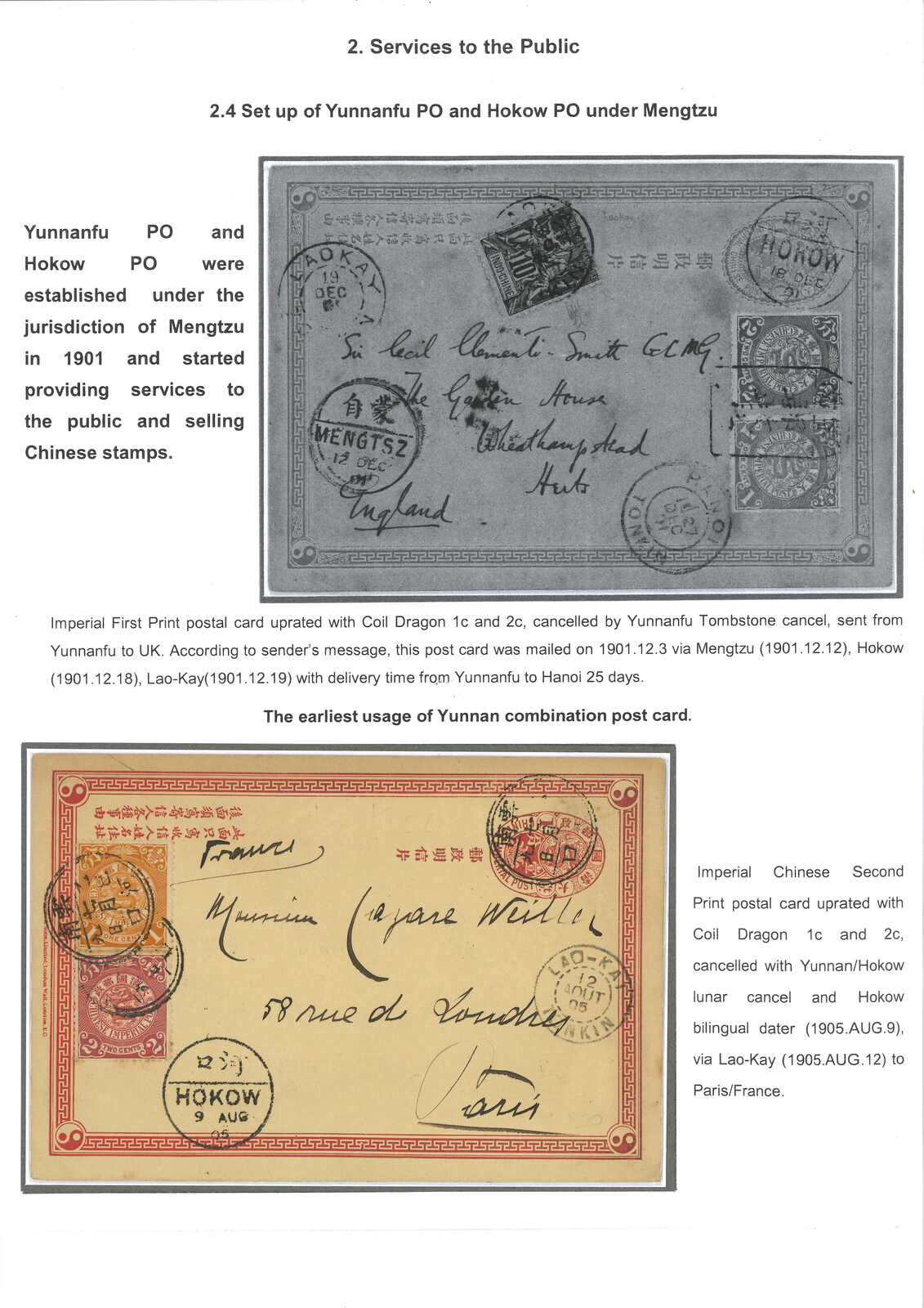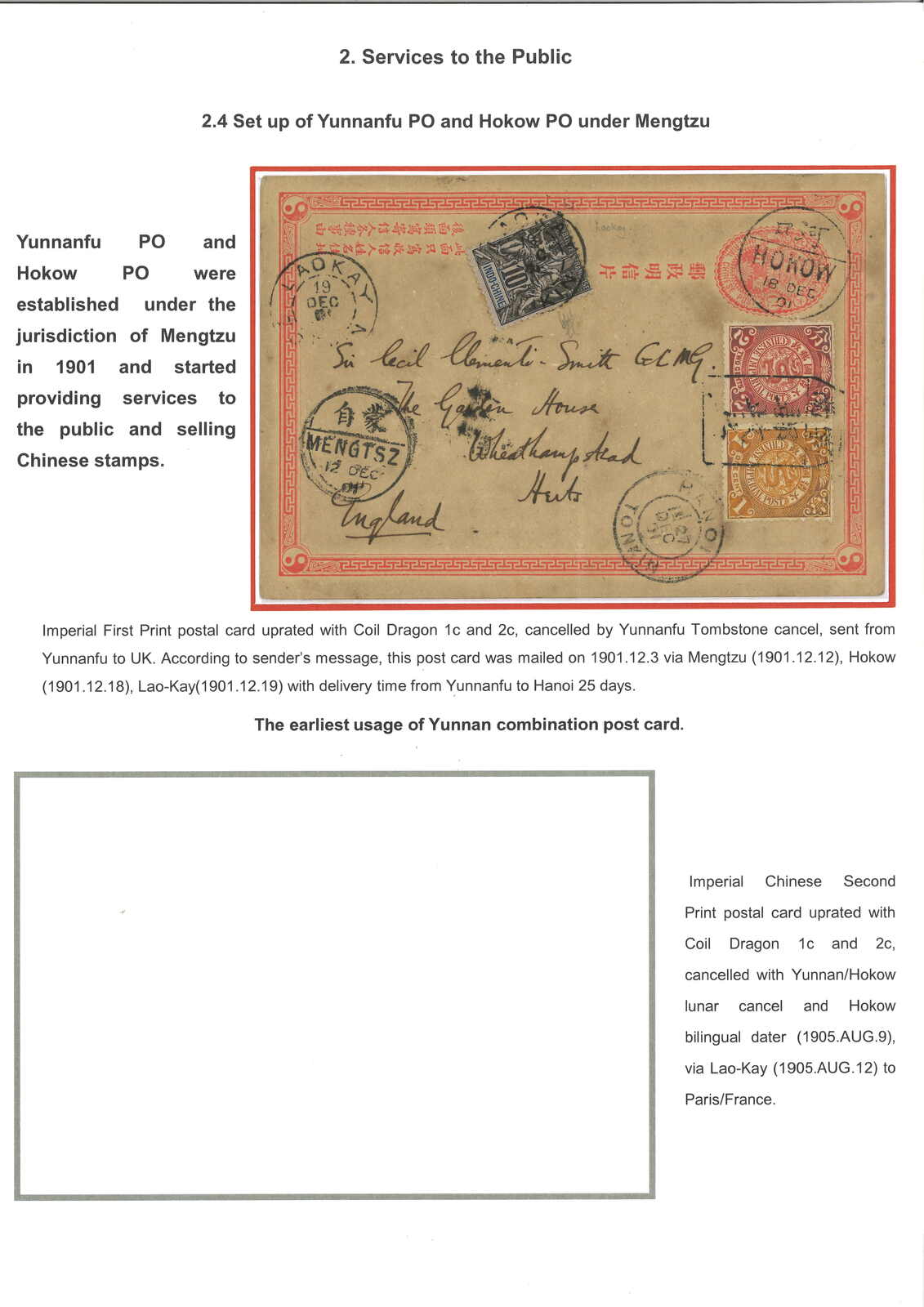 610 cover image1901 Yunnanfu (3 Dec) to England. ICP 1st Print PSC, uprated by Coiling Dragon 1c + 2c, tied by Yunnanfu PO tombstone cancel. Transit Mengtsz (12 Dec), Hokow (18 Dec) and cancelled indicia. In combination with Navigation and Commerce issue, tied by Laokay (19 Dec) cds. Further transit Hanoi (27 Dec). 25 days of transit from Yunnanfu to Hanoi. This tombstone cancel is the earliest cancel used by Imperial Post in Yunnanfu, not to mention in combination with French Indochina issues. Only about 20 combination mails of French Indochina issues from Yunnan are known to exist and it is the earliest postcard. Illustration 7, p. 22 in "The Development of Yunnan Post System 1901-1949" by Mah Lang Moe. 2019 ROCUPEX TAIPEI & R.O.C.-Thailand Stamp Exhibition. 2020 (Aug) "Postal Service Today / Republic of China" Issue 752 p. 22 illustration.