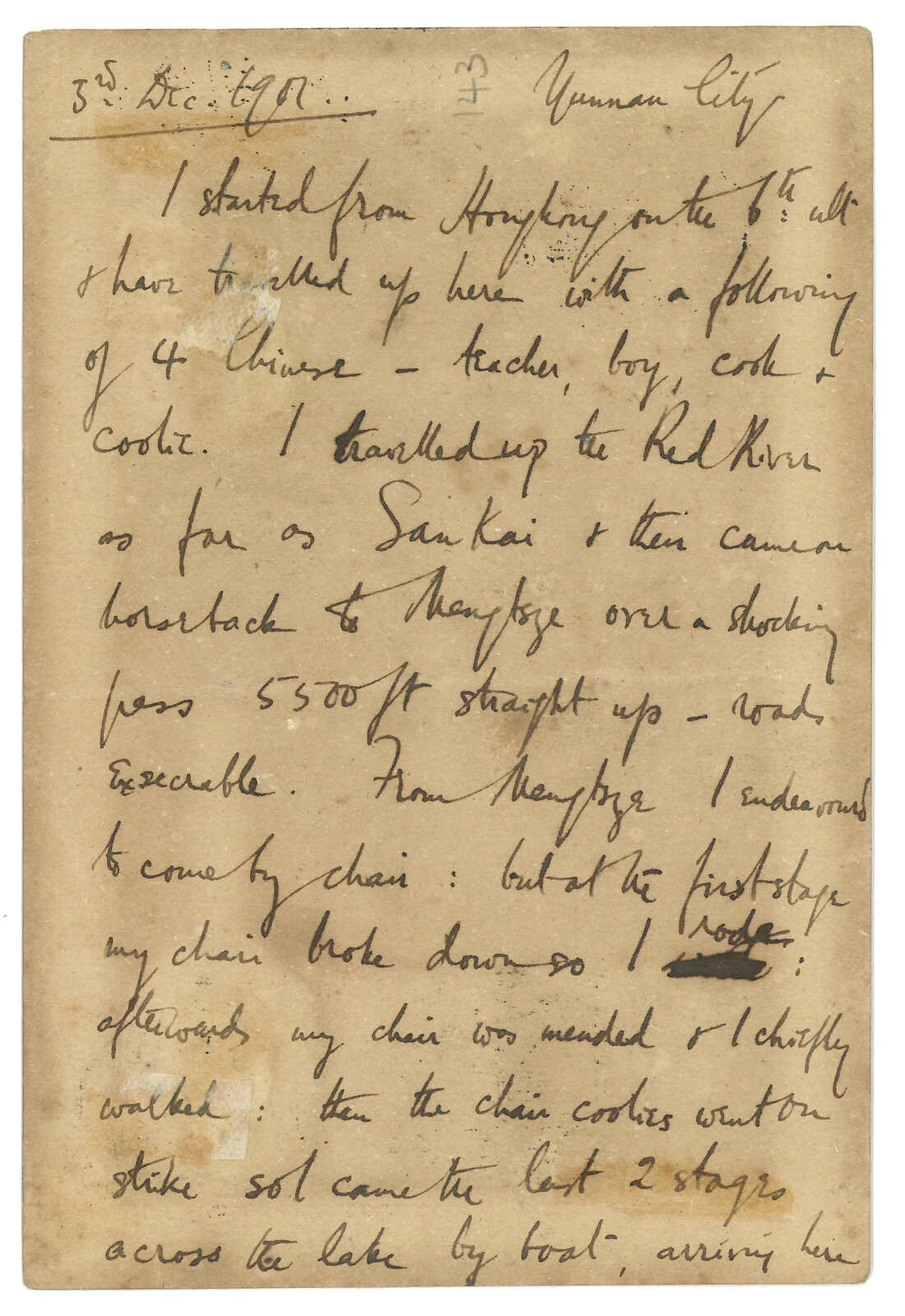 1901.12.3 雲南府寄英國。大清第一次郵資片,加貼蟠龍1分 + 2分,銷雲南府郵政局碑形戳。12.12經蒙自,12.18經河口,並蓋銷郵資圖。加貼航海及商貿神像25生丁,銷老街12.19日戳。12.27經河內。從雲南府至河內共25天。此碑形戳為雲南府大清郵局使用之最早郵戳。混貼法國票之雲南封片亦甚罕,存世僅約20件,此為當中最早之明信片。 馬蘭茂著《雲南郵政史1901-1949》第22頁圖六原件。 2019年中泰聯合郵展特刊第67頁原件。 2020年8月《今日郵政》752期第22頁原件。(Image 1) (Image 2)