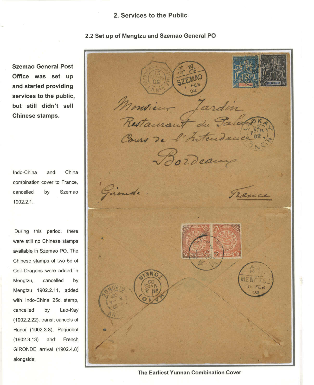 612 cover image1902 Szemao (1 Feb) to France, applied with Szemao bisected bilingual cds on front. F.w. Coiling Dragon 5c in pair on reverse for international letter rate upon transit at Mengtsz (11 Feb). In combination with Navigation and Commerce issue 15c + 10c, tied by Laokay (22 Feb) cds. Transit Hanoi (3 Mar), French Paquebot (13 Mar). Arrived Gironde (8 Apr). Cover opened out for display. Only about 20 combination mails of French Indochina issues from Yunnan are known to exist and it is the earliest cover. Szemao Pos Office has inaugurated for 3 months by the time of this cover but stamps were still not available. Illustration 10, p. 24 in "The Development of Yunnan Post System 1901-1949" by Mah Lang Moe. 2019 ROCUPEX TAIPEI & R.O.C.-Thailand Stamp Exhibition. 2020 (Aug) "Postal Service Today / Republic of China" Issue 752 p. 22 illustration.