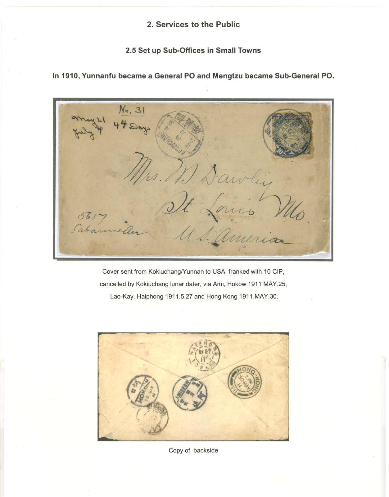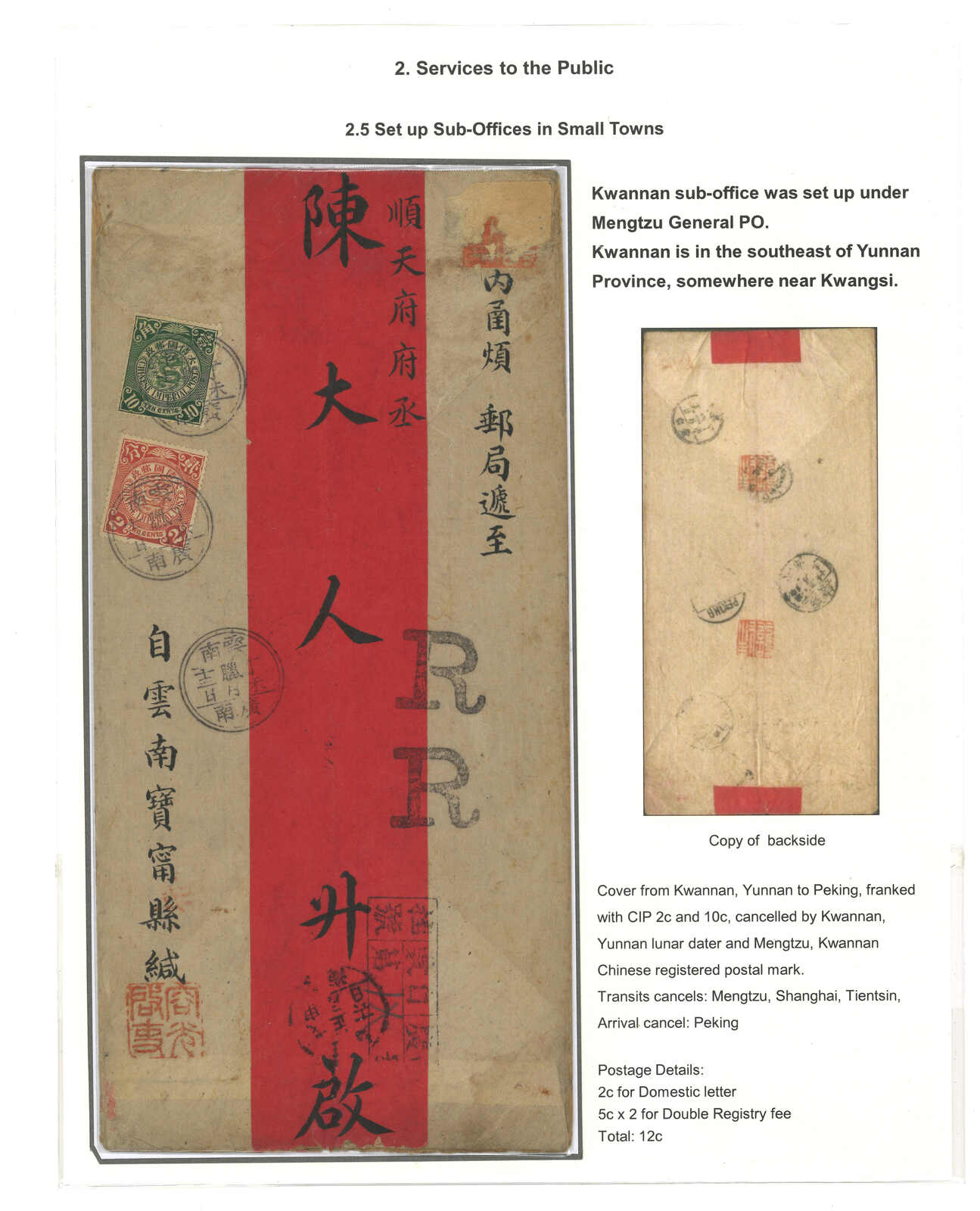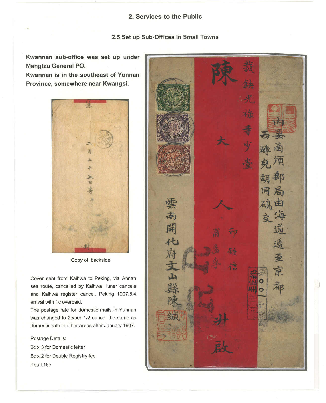 613 cover image1909 Kwannan (10 Jan) to Peking. Double-registered red band cover, f.w. Coiling Dragon 2c + 10c for domestic double registered rate, tied by Yunnan Kwannan double-ringed lunar year cds., alongside with RR mark and Mengtsz Kwannan registered mark. Trasit Shanghai (6 Feb), Tientsin (9 Feb). Arrived Peking (11 Feb). Before Jan 1907, mails from Yunnan via Tonkin or Burma had to pay international postage. But since Feb 1907, domestic mails from Yunnan via sea route were no longer handled by French Indochina post so only domestic postage was charged. But mails taking Burma route still had to pay international postage. Illustration 19, p. 29 in "The Development of Yunnan Post System 1901-1949" by Mah Lang Moe. 2019 "Asian Philatelists" Issue 10 p.181 illustration.