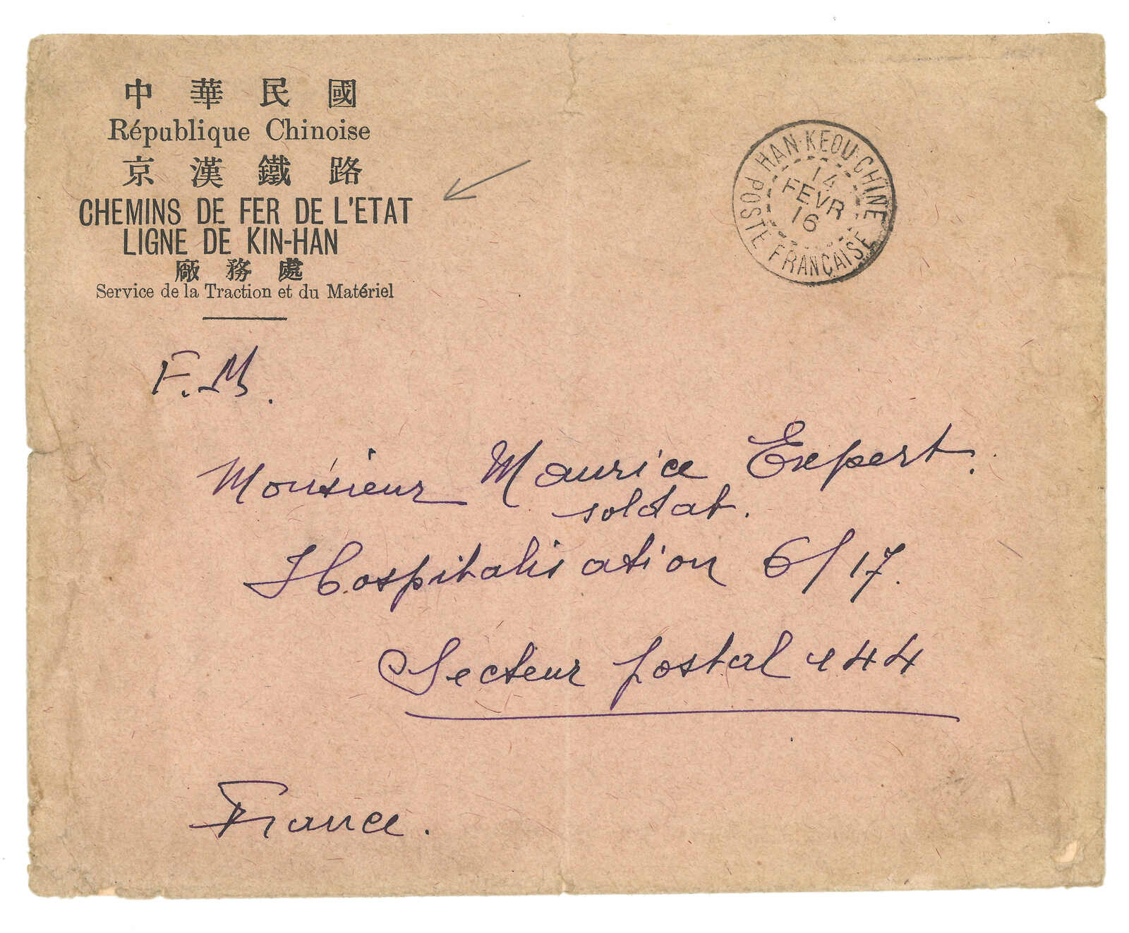 249 cover image1916 (14 Feb) Traction and Maaterial Service, Peking-Hankow Railway cover from Hankow to France, frankless, applied with Hankow French PO cds. Interesting material for railway postal history.