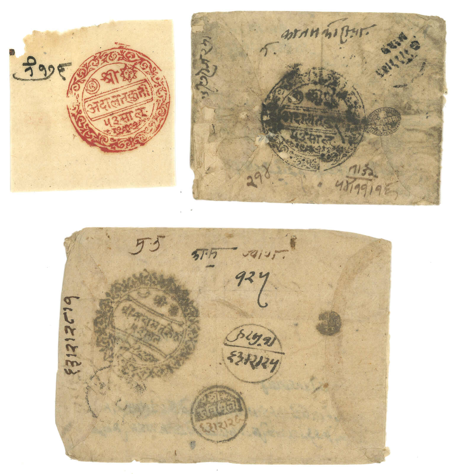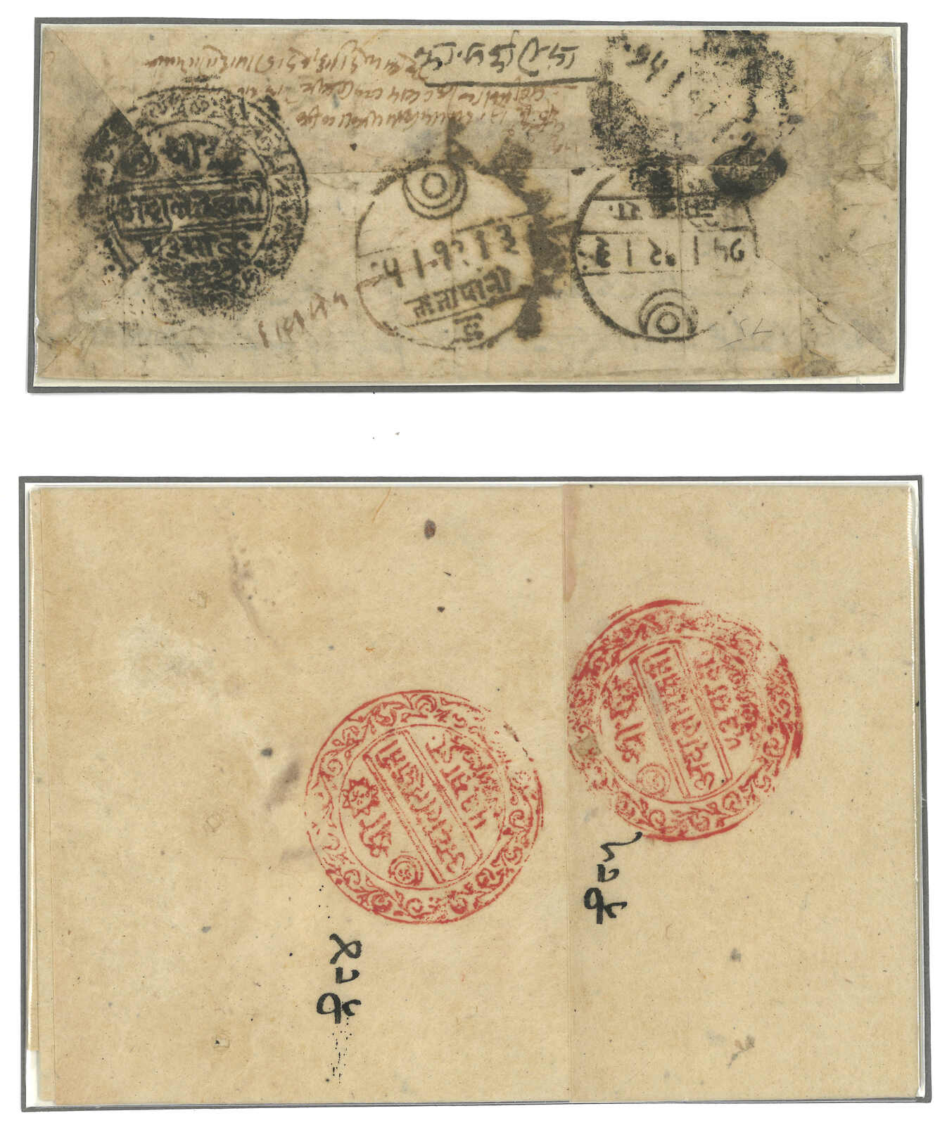 ca 1900 a pair of Nepalese Court registered covers from Kuti and Kerong, plus a piece of Kuti Court seal. Showing court seals,