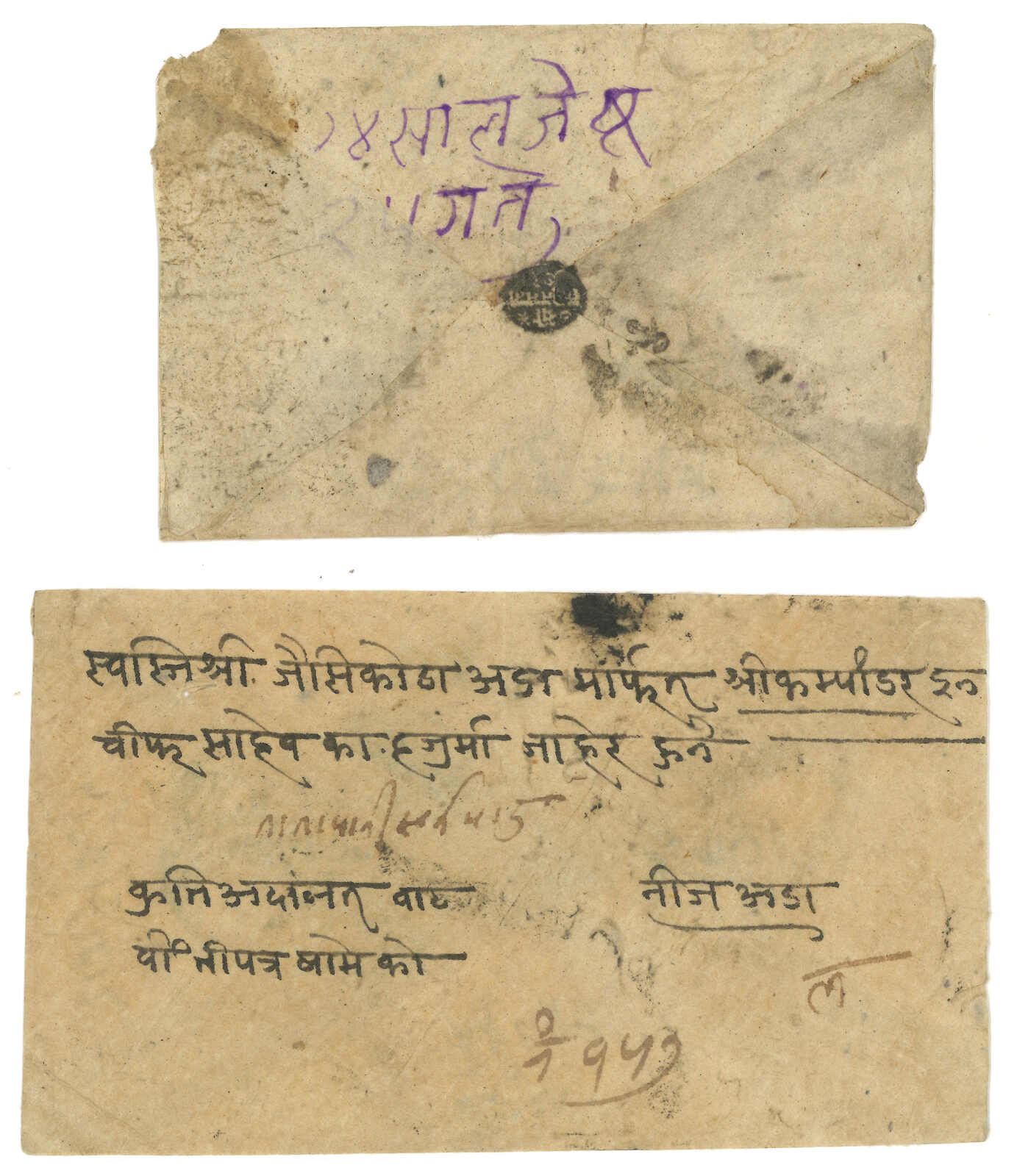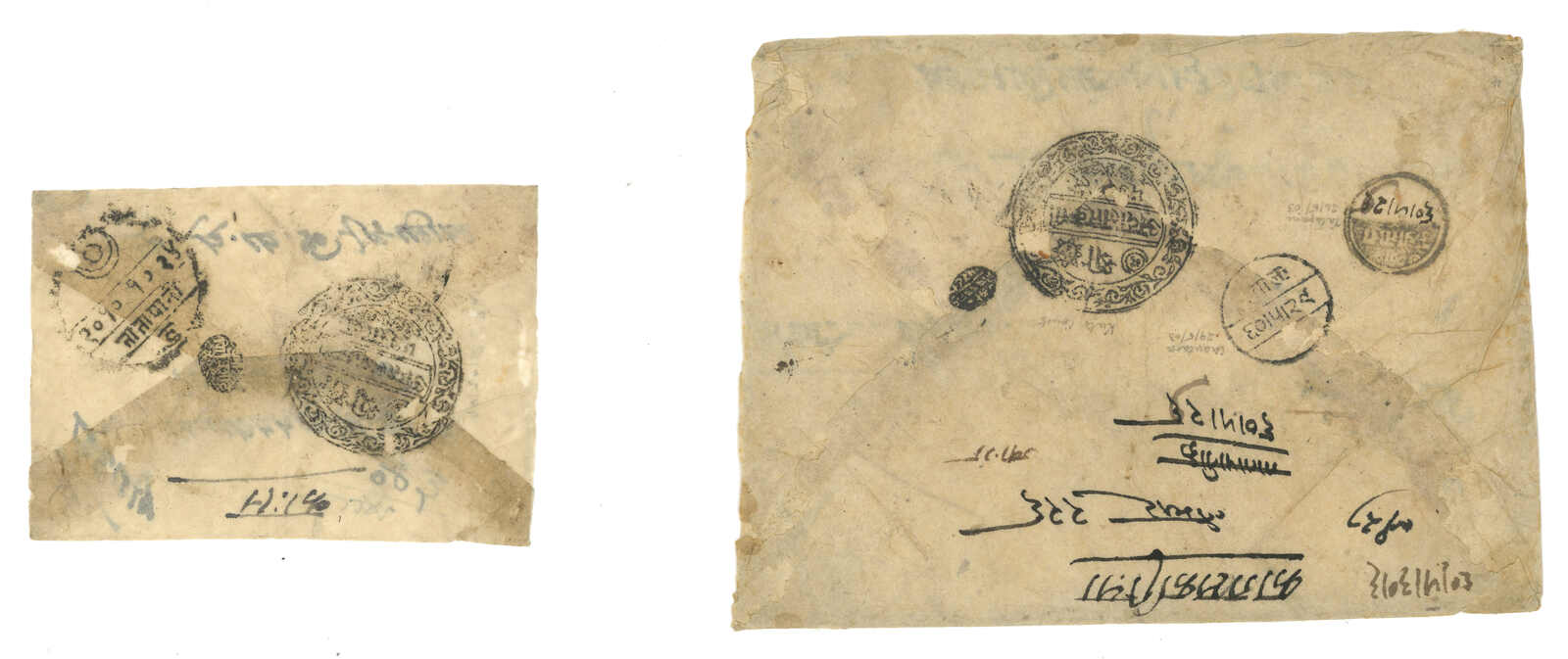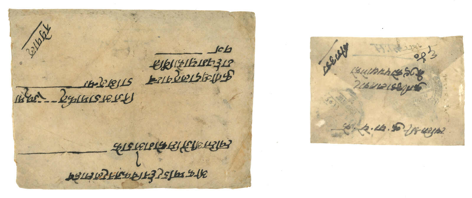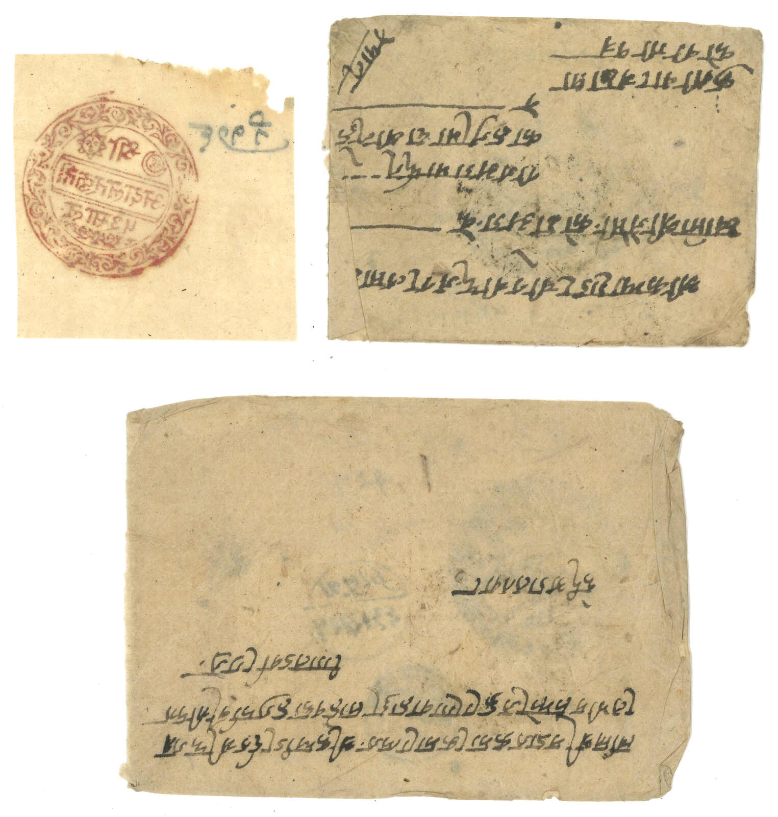 約1900年代一對尼泊爾法庭公函,一件出自聶拉木,一件出自濟隴, 另附一件聶拉木法庭公章剪片。兩件信封均帶有法庭公章。(Image 1)